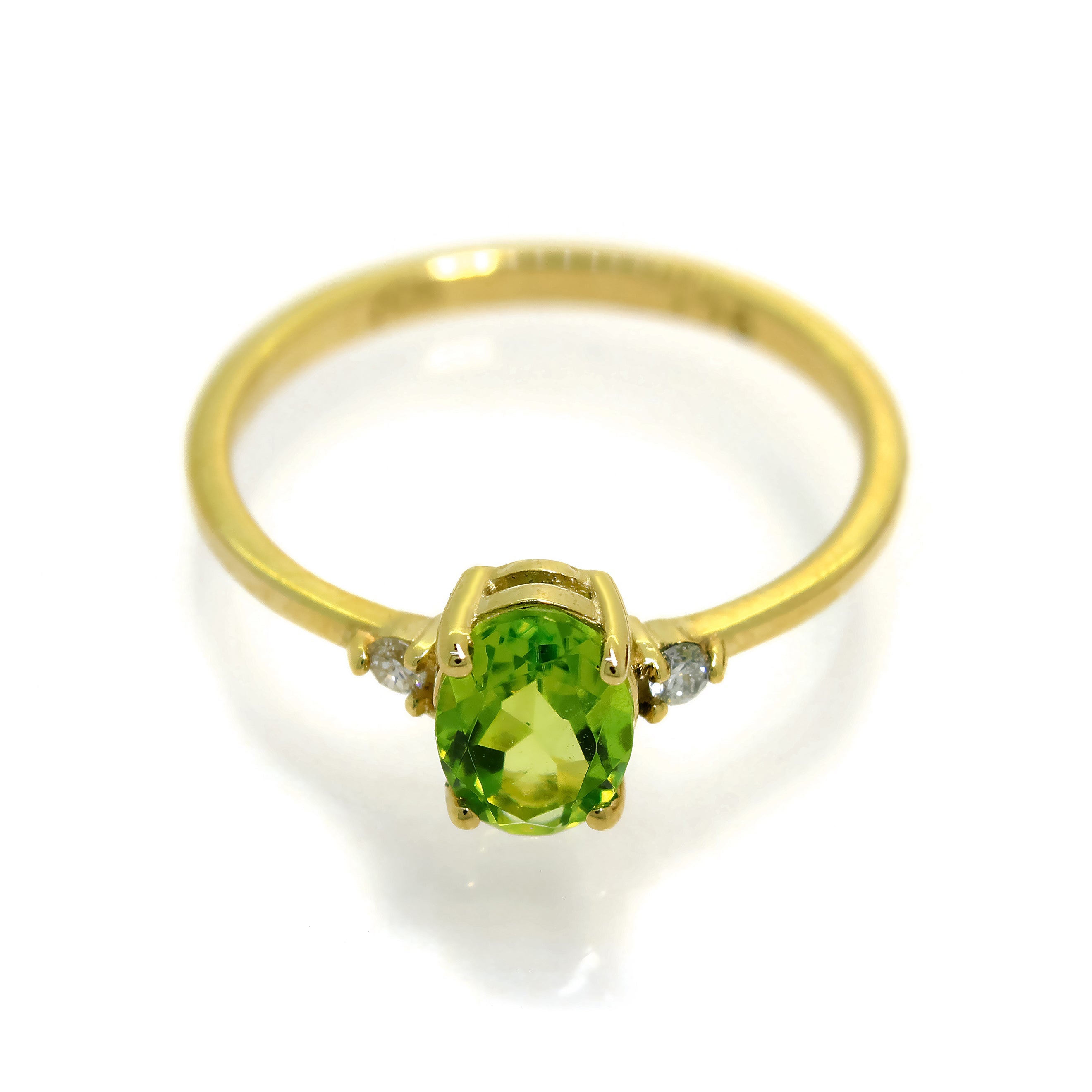 A dainty and elegant yellow gold ring with a stunning trio of 7x5mm peridot and diamonds.