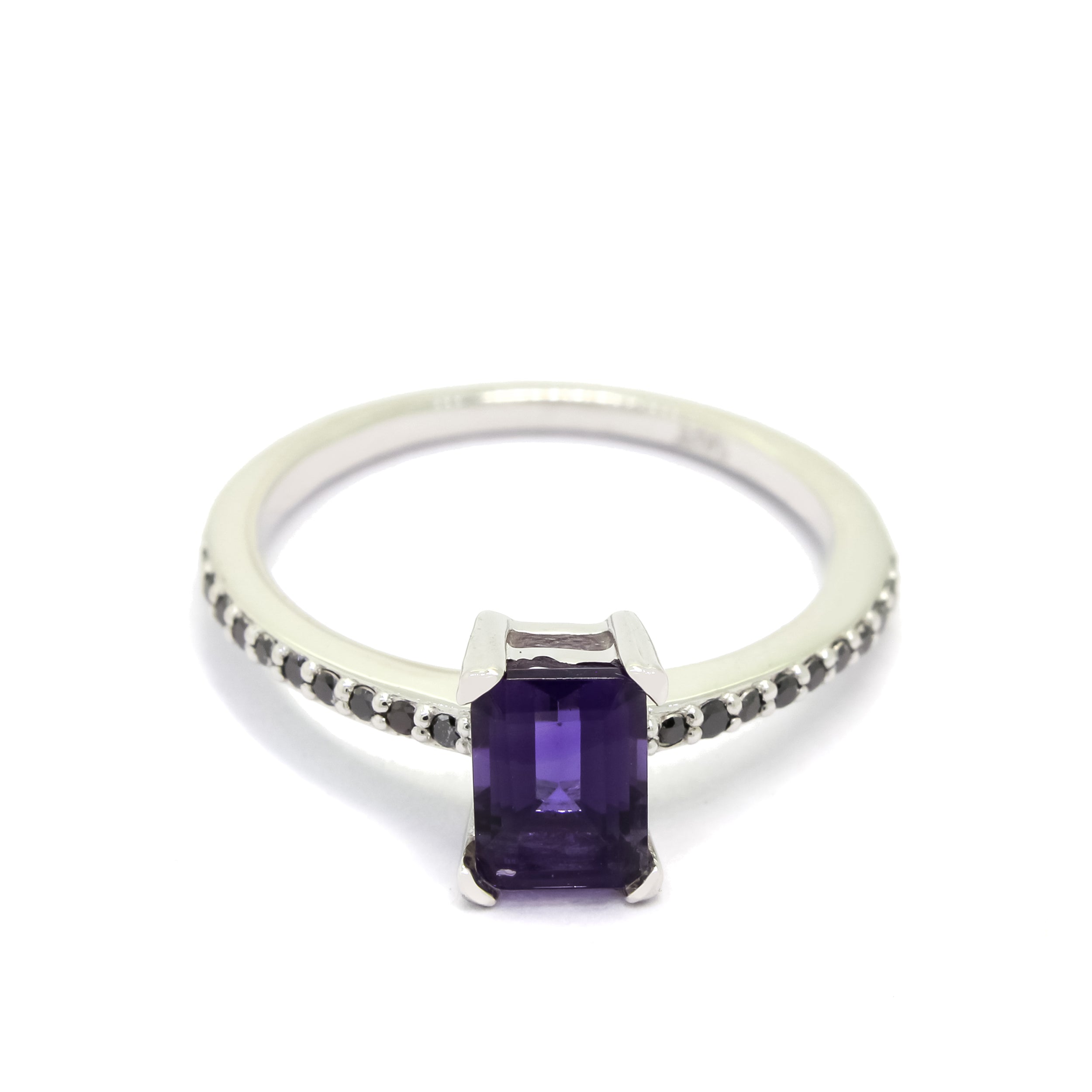 A delicate and sophisticated iolite and black diamond ring, appropriate for any occasion.