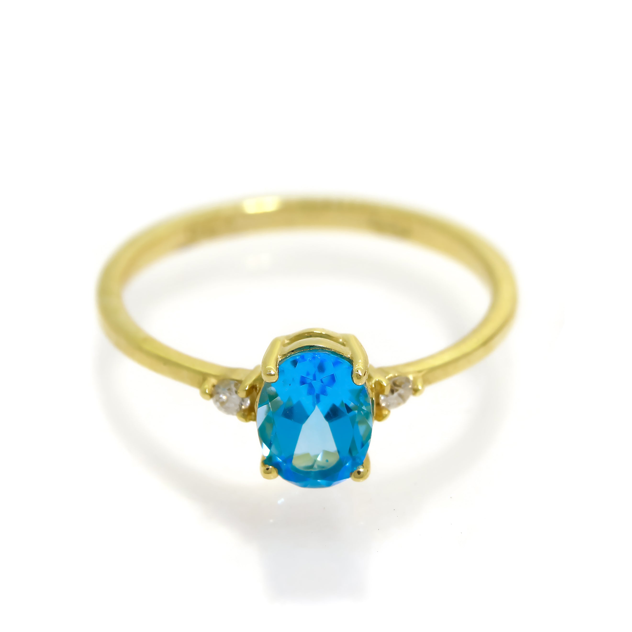 A dainty and elegant yellow gold ring with a stunning trio of 7x5mm blue topaz and diamonds.