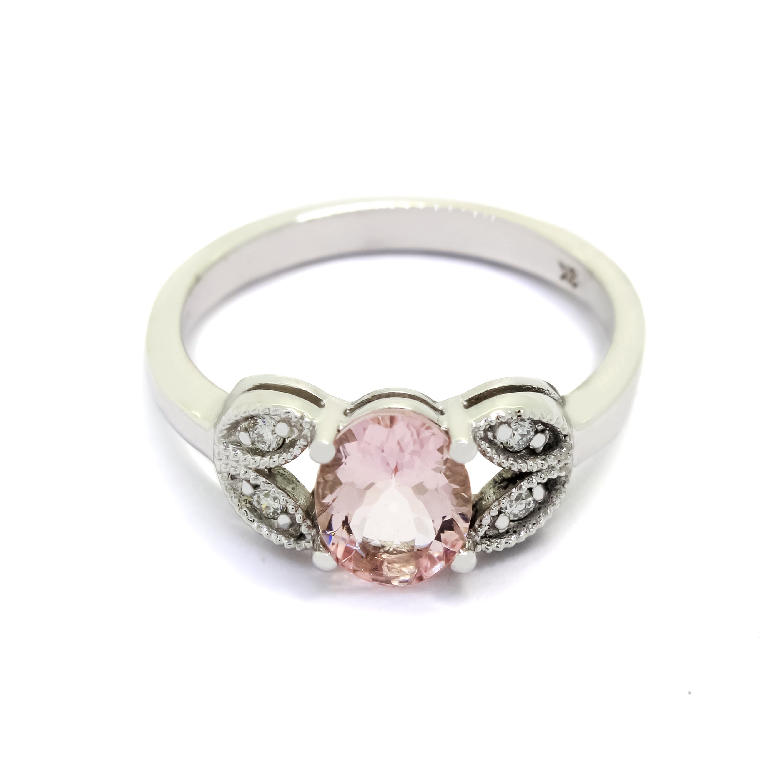An elegant morganite and diamond ring with floral gold detailing.