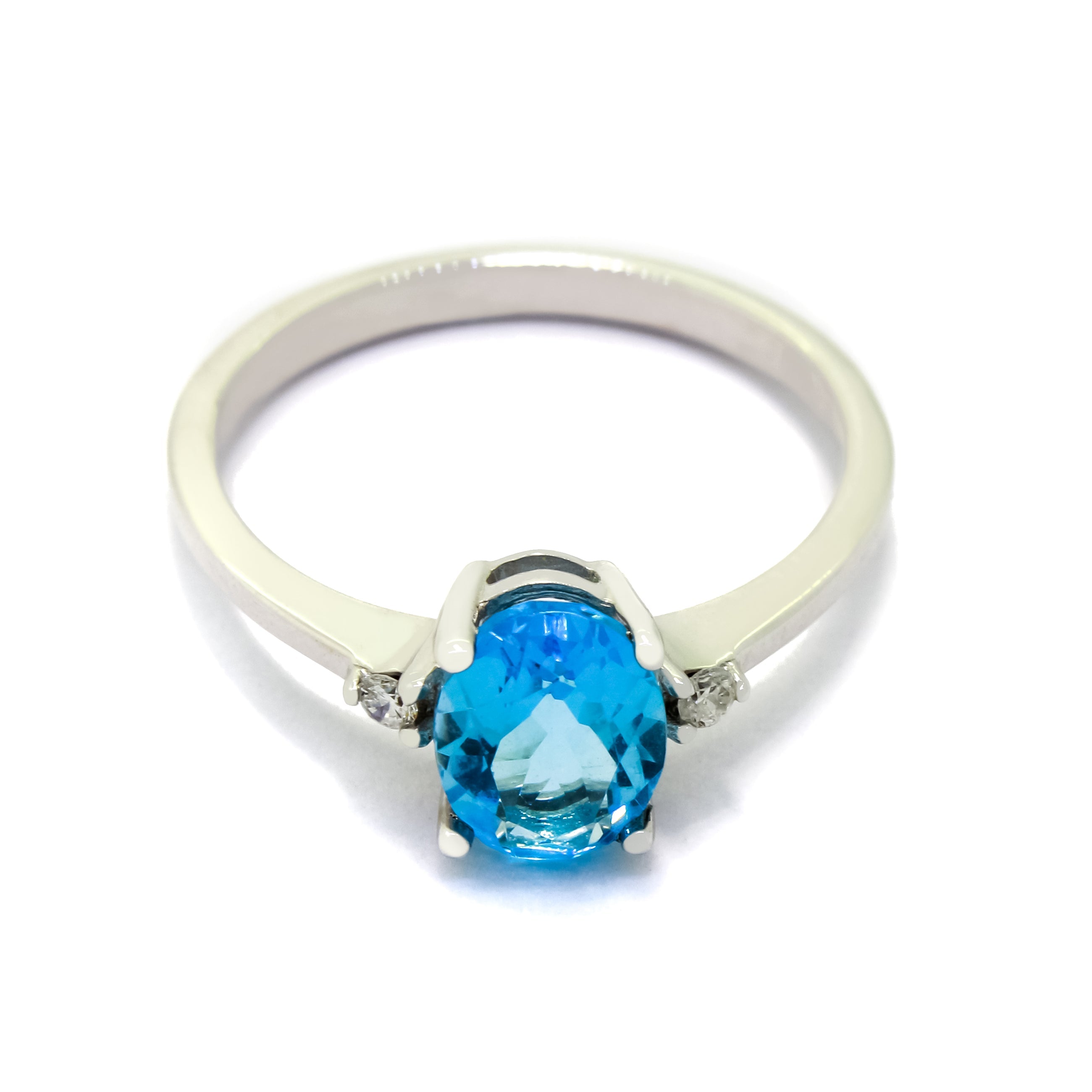 An elegant white gold ring with a stunning trio of 8x6mm blue topaz and diamonds.