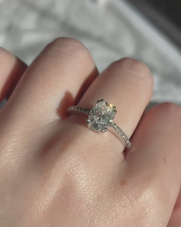 A luxurious and feminine moissanite solitaire ring with a moissanite-embedded silver pavé band.
