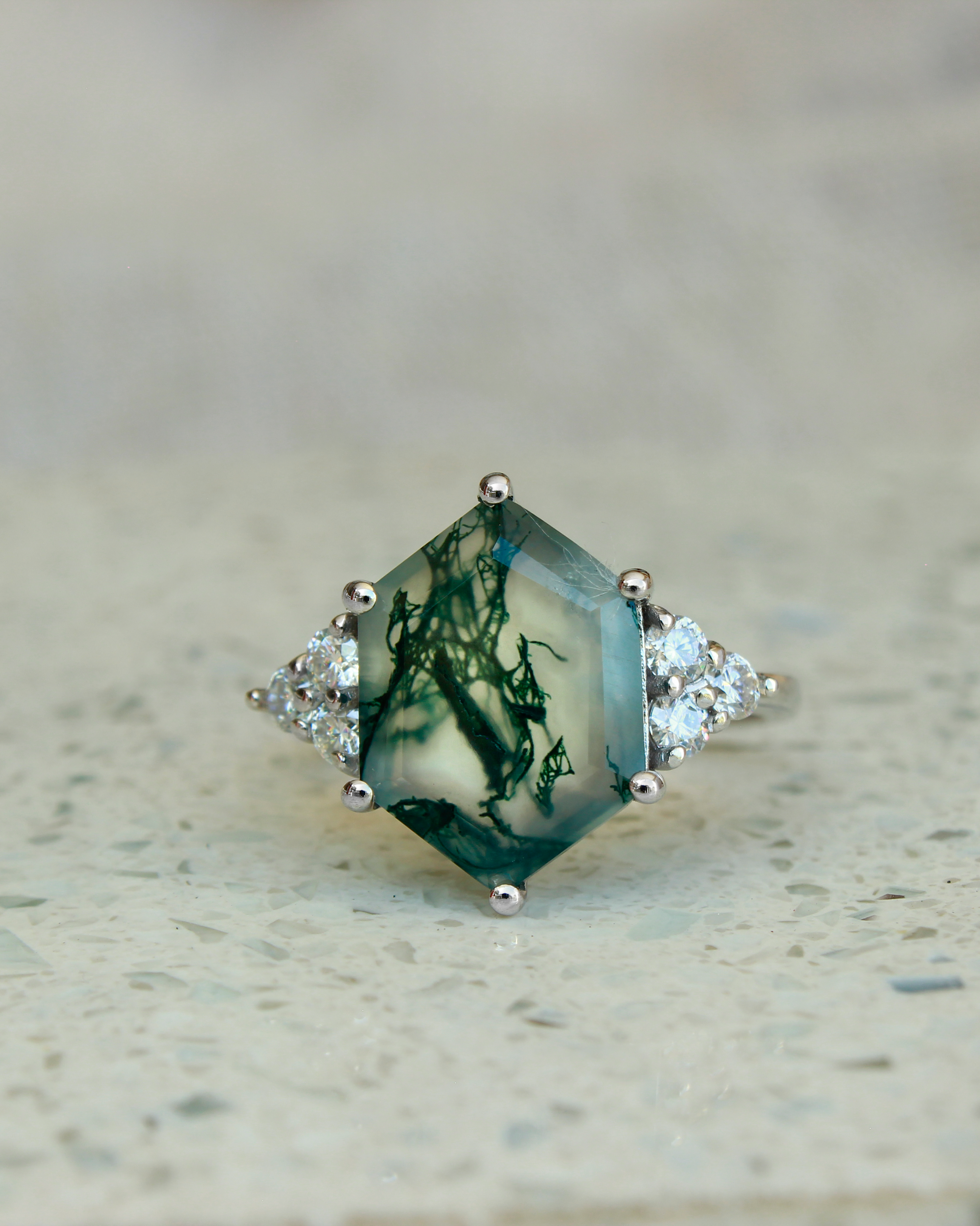 A luxurious statement moss agate ring featuring an impressive 14x10mm hand-cut hexagonal stone and trio diamond detailing, perfect for lovers of nature and the unusual.