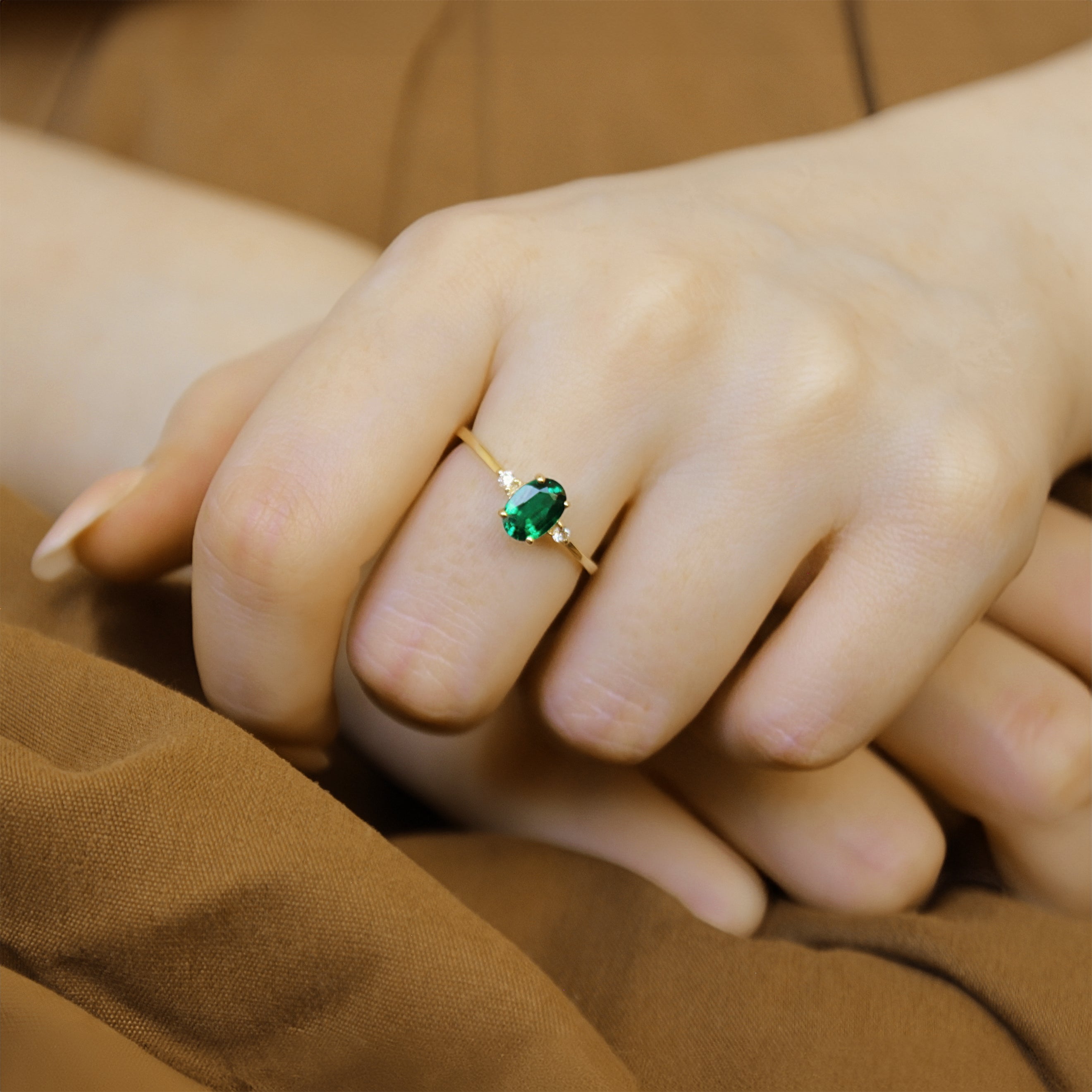 A dainty and elegant yellow gold ring with a stunning trio of 7x5mm lab-created emerald and lab diamond details.