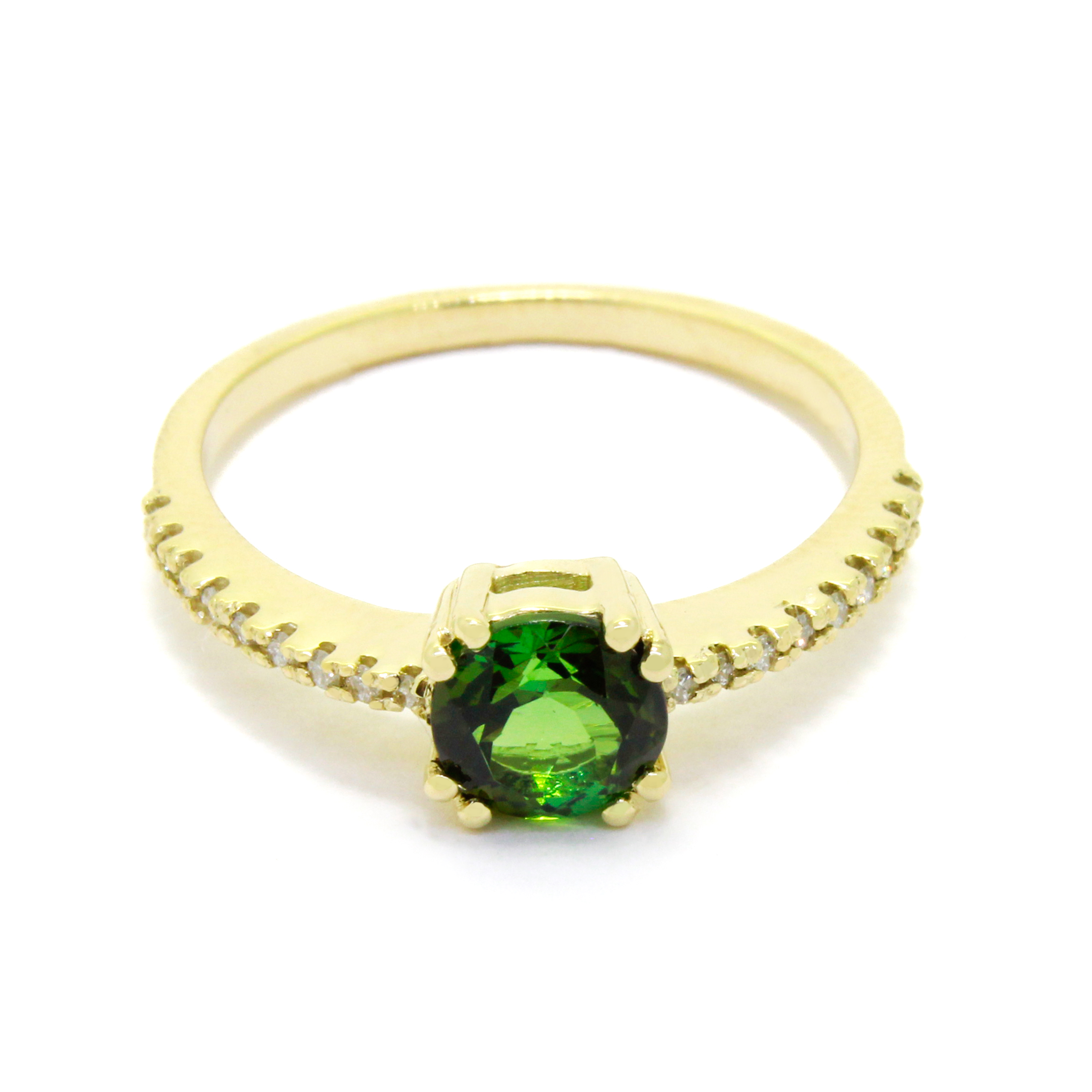 A unique twist on a solitaire ring with a diamond embedded band and green tourmaline centre stone.