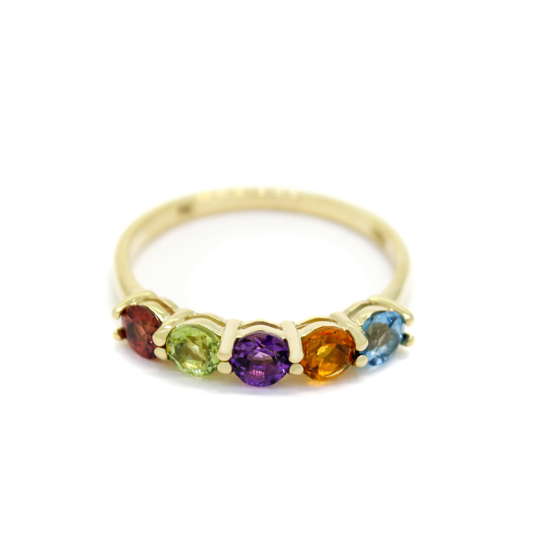 A stunning multi-jewelled ring made up of 5 4mm round-cut rainbow jewels - garnet, peridot, amethyst, citrine and blue topaz - for a playful and dazzling look.