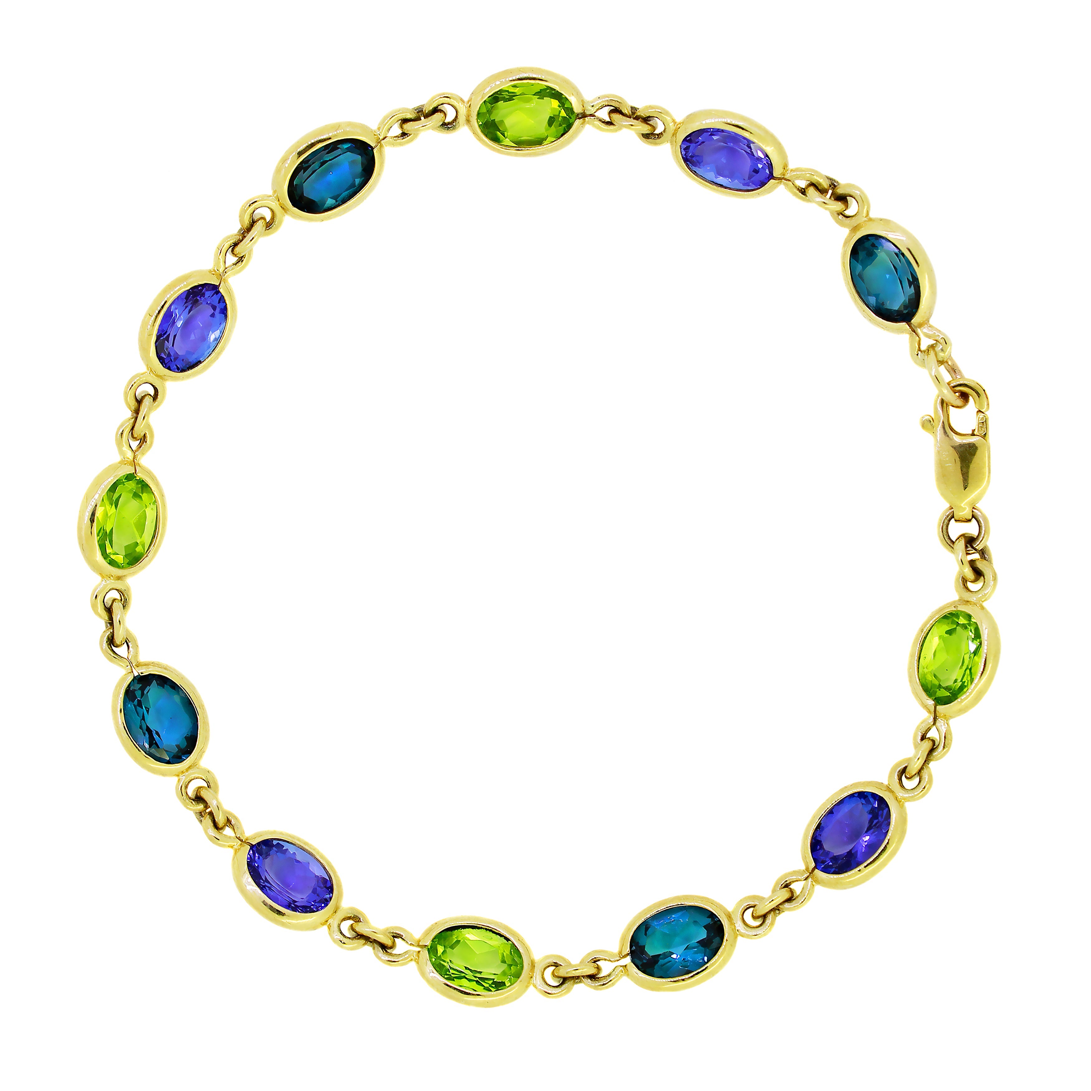 A luxuriously bejewelled golden bracelet made up of 12 7x5mm oval jewels, alternating between tanzanite, London Blue topaz and peridot.