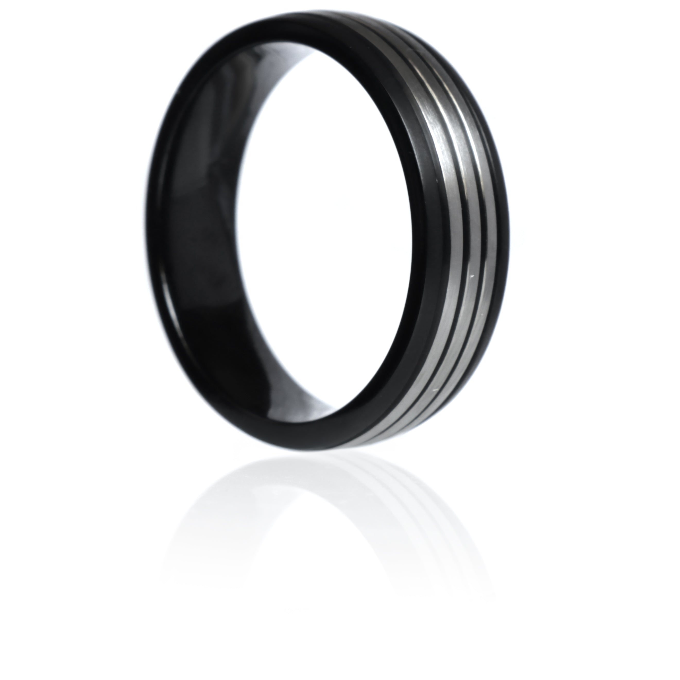 The Zakai titanium ring features alternating bands of polished and brushed black & classic titanium finishes. The dual-tone design creates a modern, sophisticated look, making it a perfect choice for a contemporary wedding band or a stylish everyday ring.
