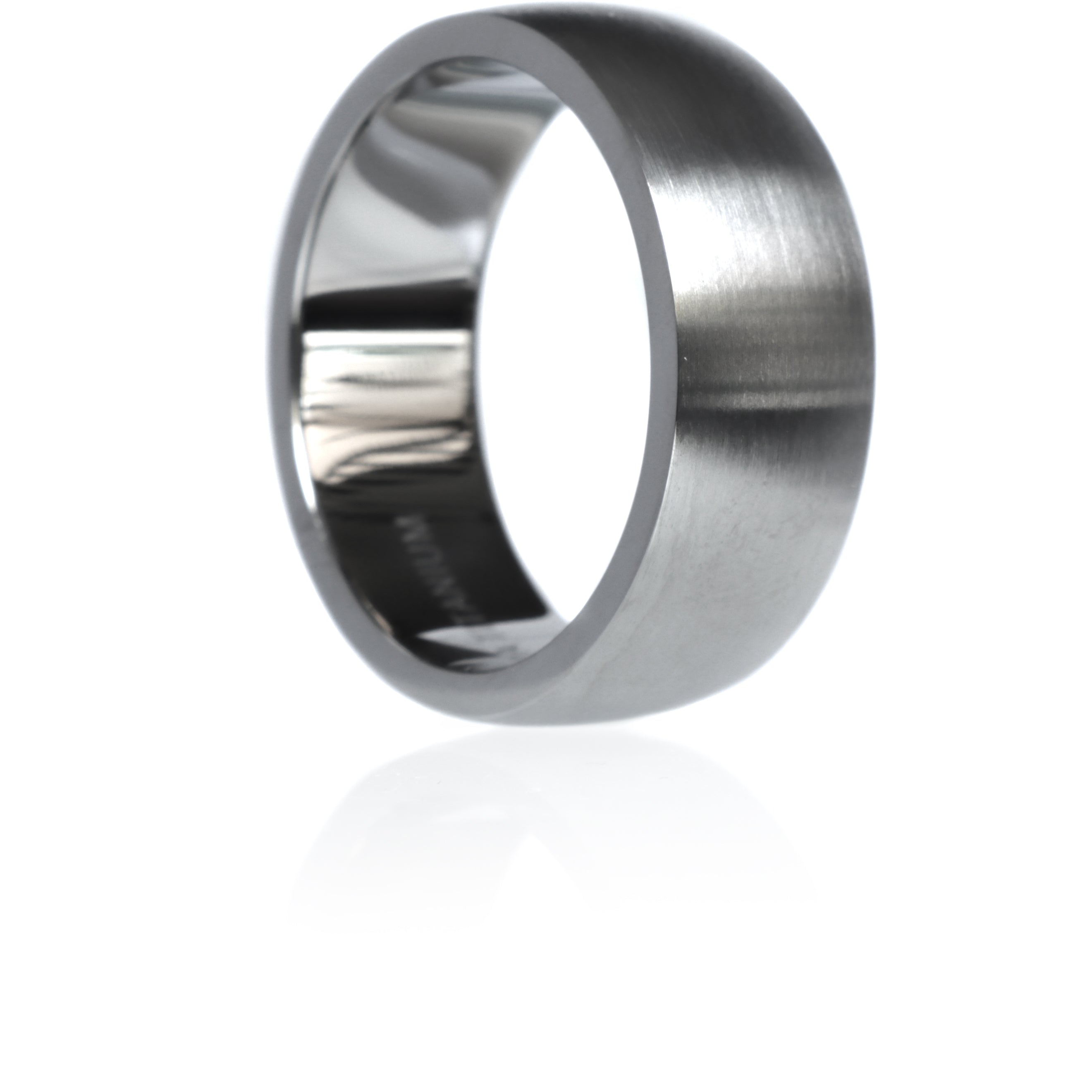 Perfect for a bold wedding band or a substantial statement ring, the Titan ring features a wide, 9mm brushed titanium band. The simple yet striking design offers a classic and masculine look with a comfortable, weighty feel.