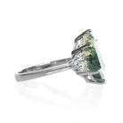 A luxurious statement moss agate ring featuring an impressive 14x10mm hand-cut hexagonal stone and trio moissanite detailing, perfect for lovers of nature and the unusual.
