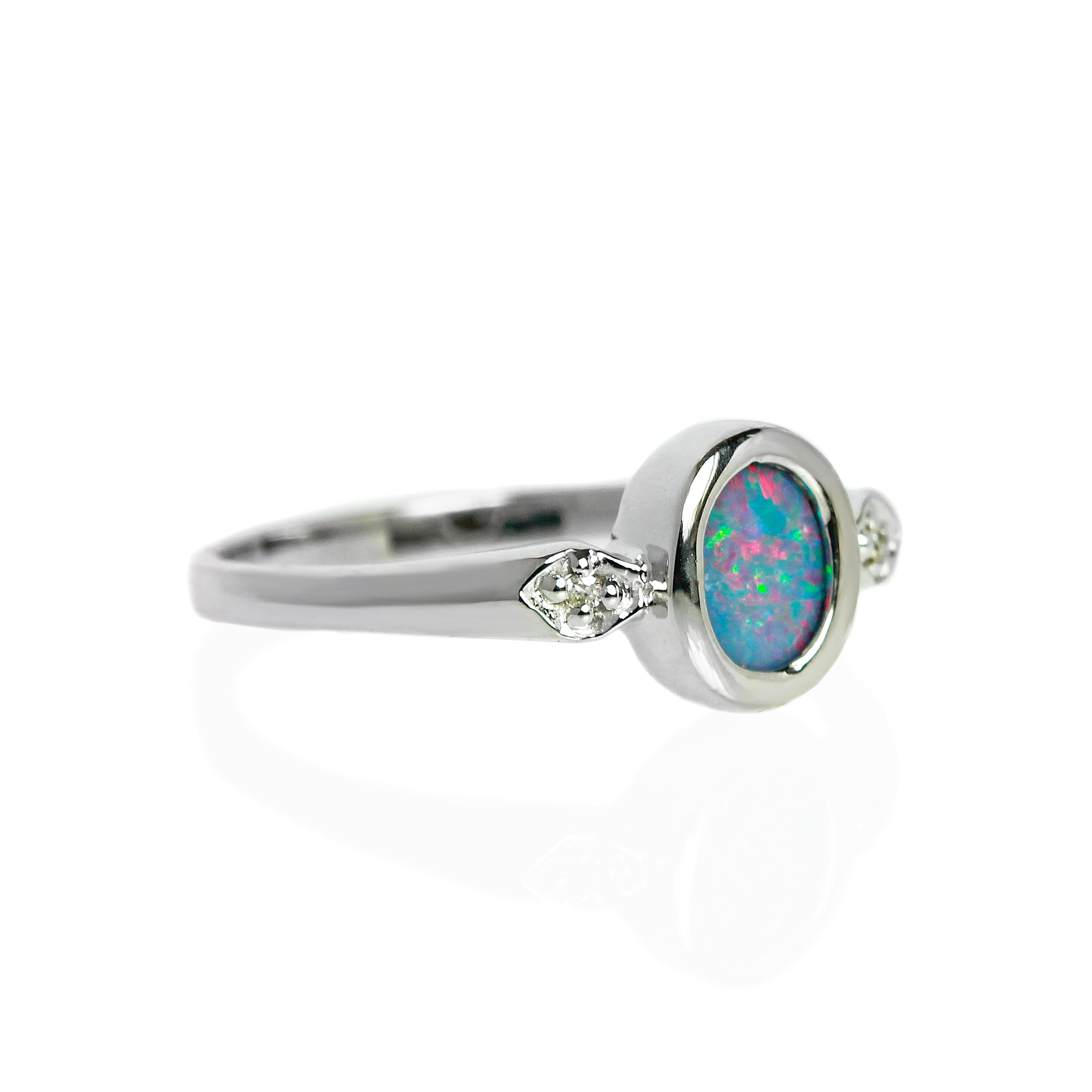 A unique silver ring with a multi-coloured opal doublet centre stone and duo moissanite detailing.