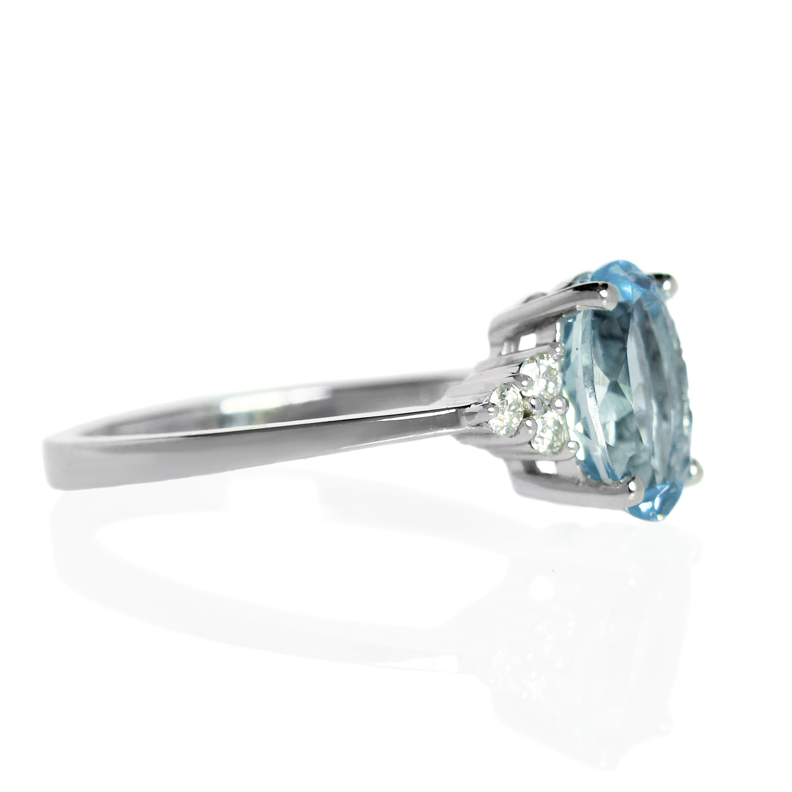 A lavish sterling silver ring with trio moissanite detailing and a stunning 9x7mm aquamarine centre stone, perfect for special occasions and engagements.