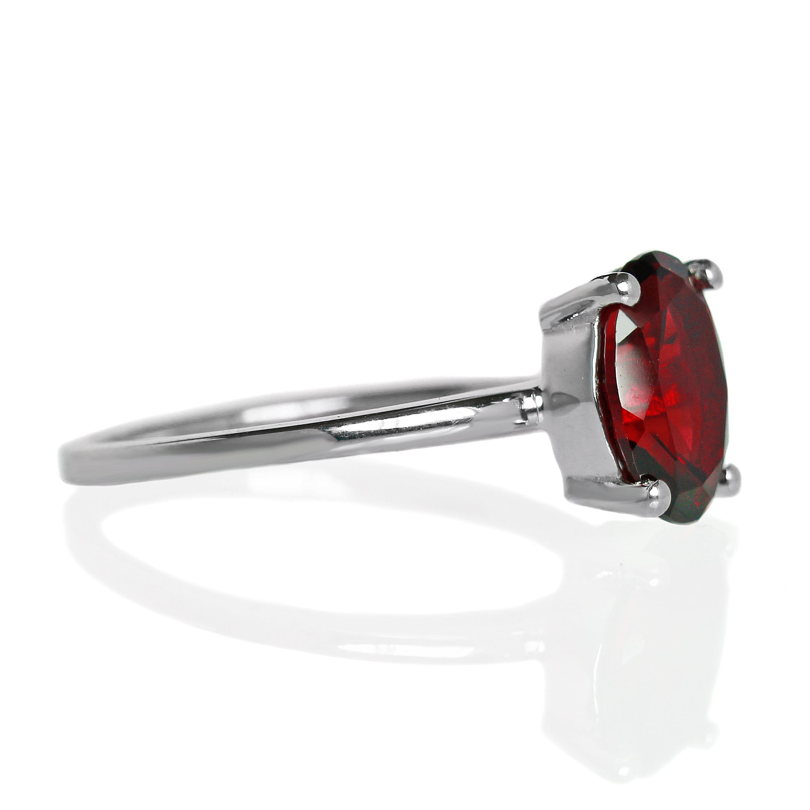 A staple silver solitaire ring, featuring a 9x7mm faceted red garnet birthstone. Appropriate for every occasion.