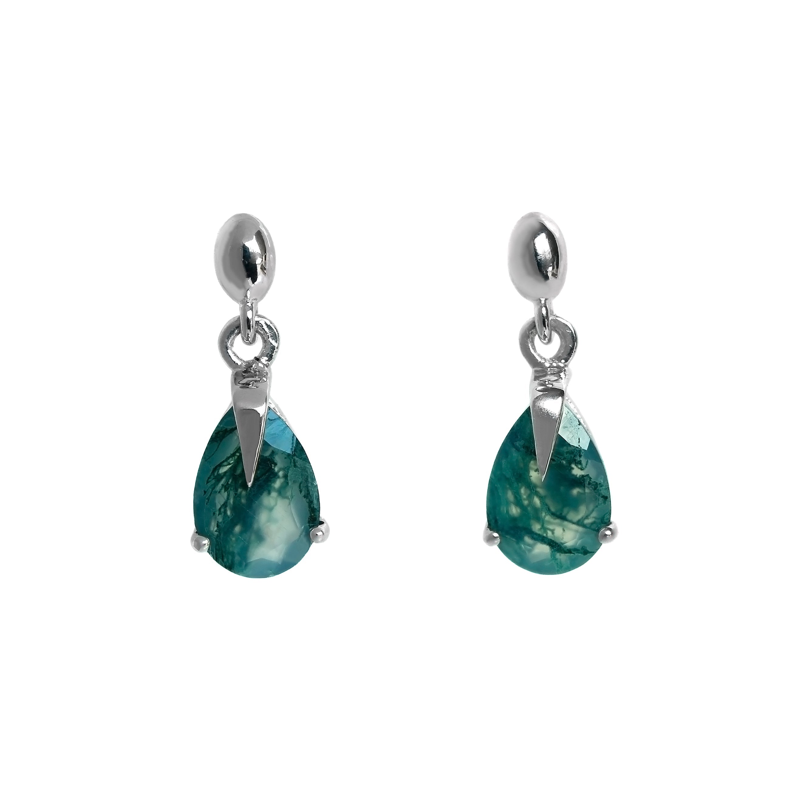 A sophisticated pair of moss agate drop earrings in solid sterling silver.