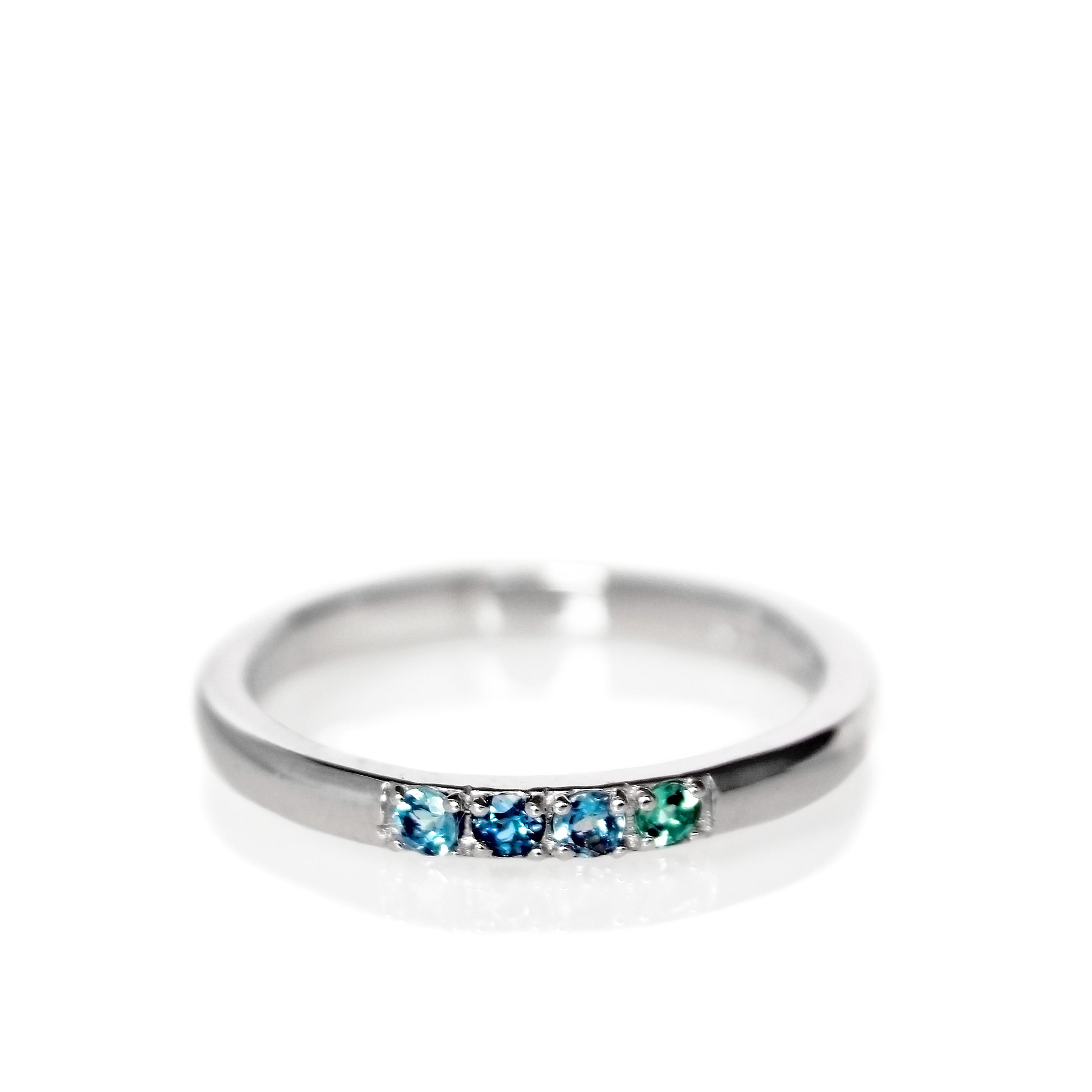 A minimalistic and sophisticated 9k white gold ring with embedded gemstone detailing, perfect for stacking or solo wear. Featuring 2mms Blue Topaz, Blue Tourmaline, Blue Topaz, Mint Blue Tourmaline gemstones.