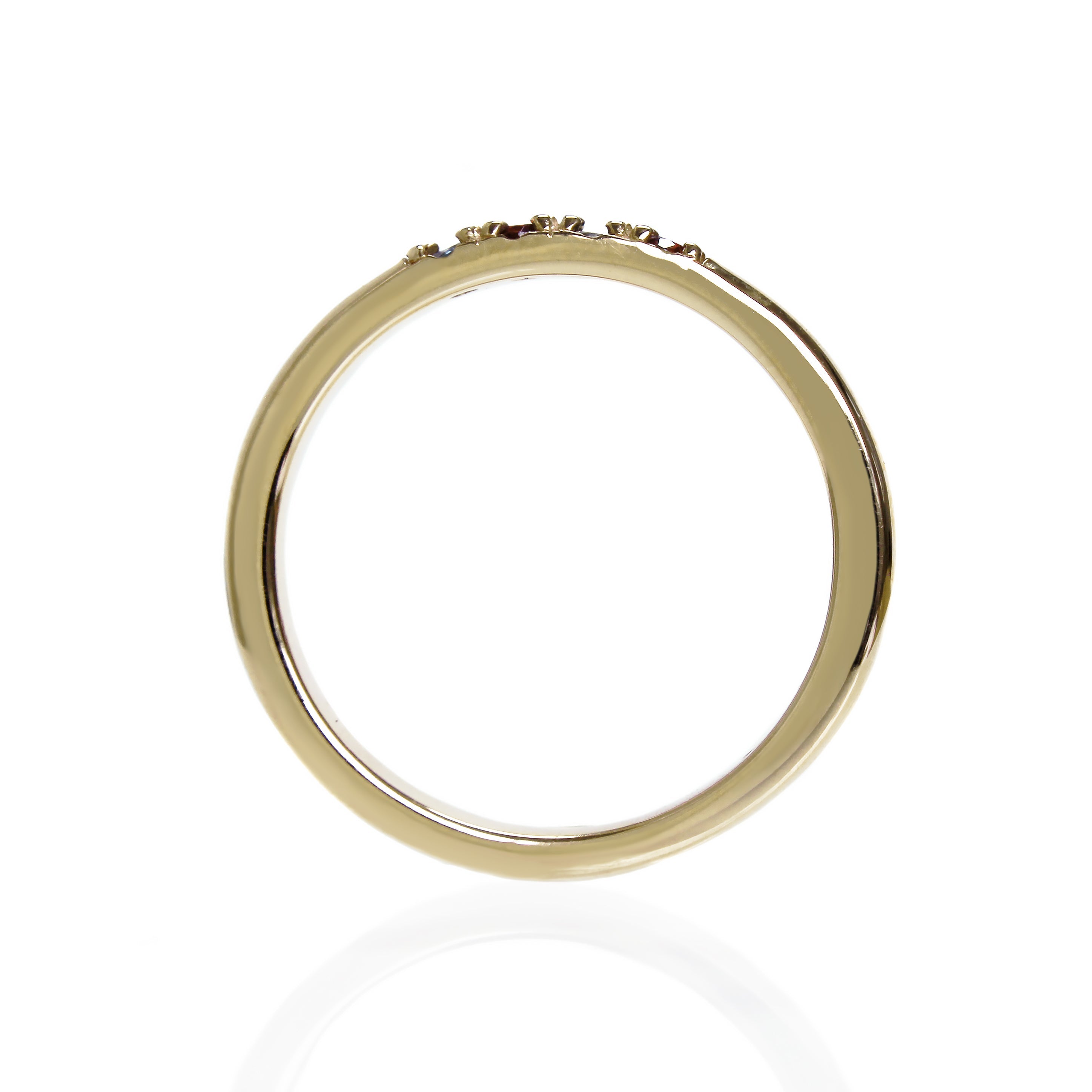 A minimalistic and sophisticated 9k yellow gold ring with embedded sapphire and moissanite detailing, perfect for stacking or solo wear.