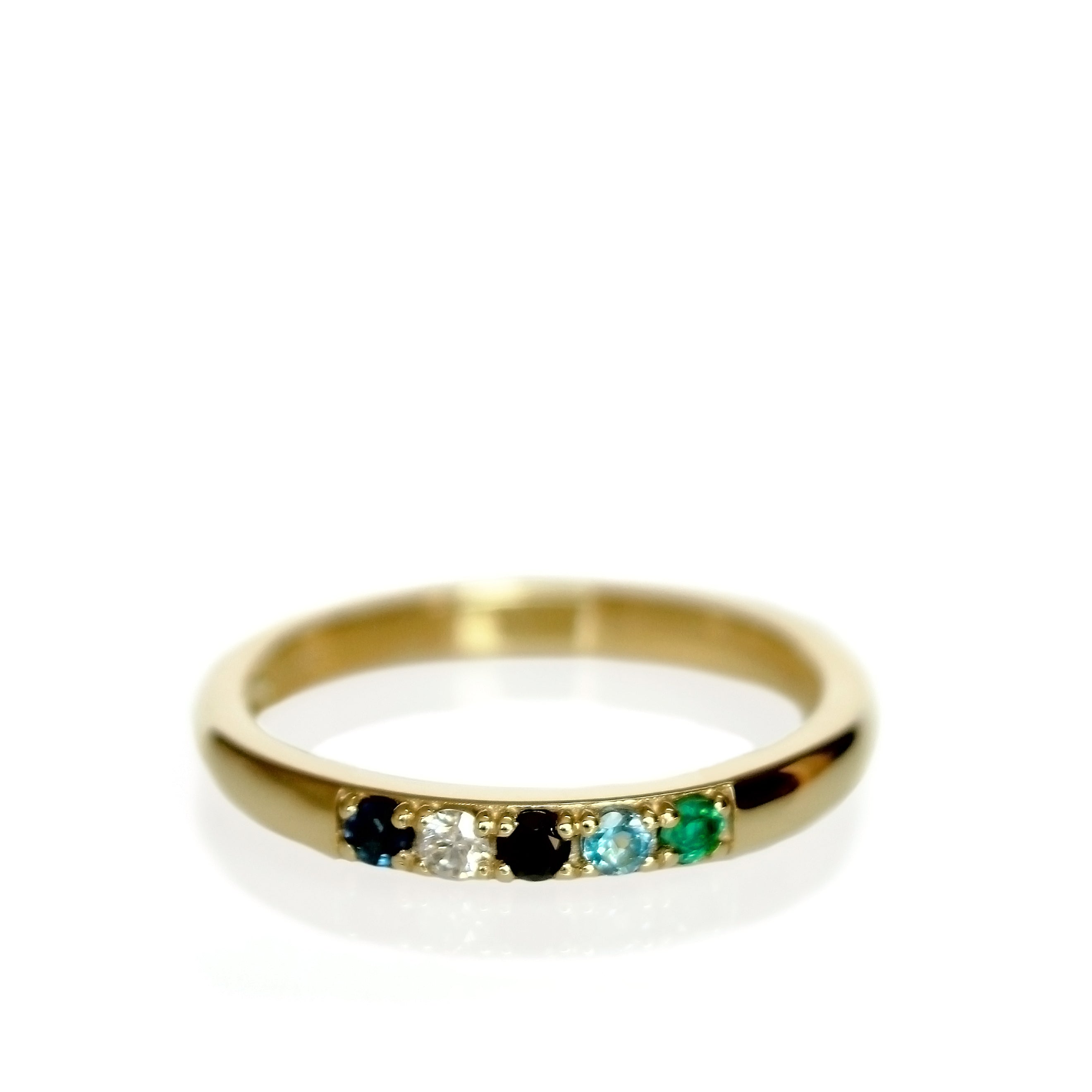 A minimalistic and sophisticated 9k yellow gold ring with embedded gemstone detailing, consisting of emerald, aquamarine, black and white diamond and sapphire, perfect for stacking or solo wear.