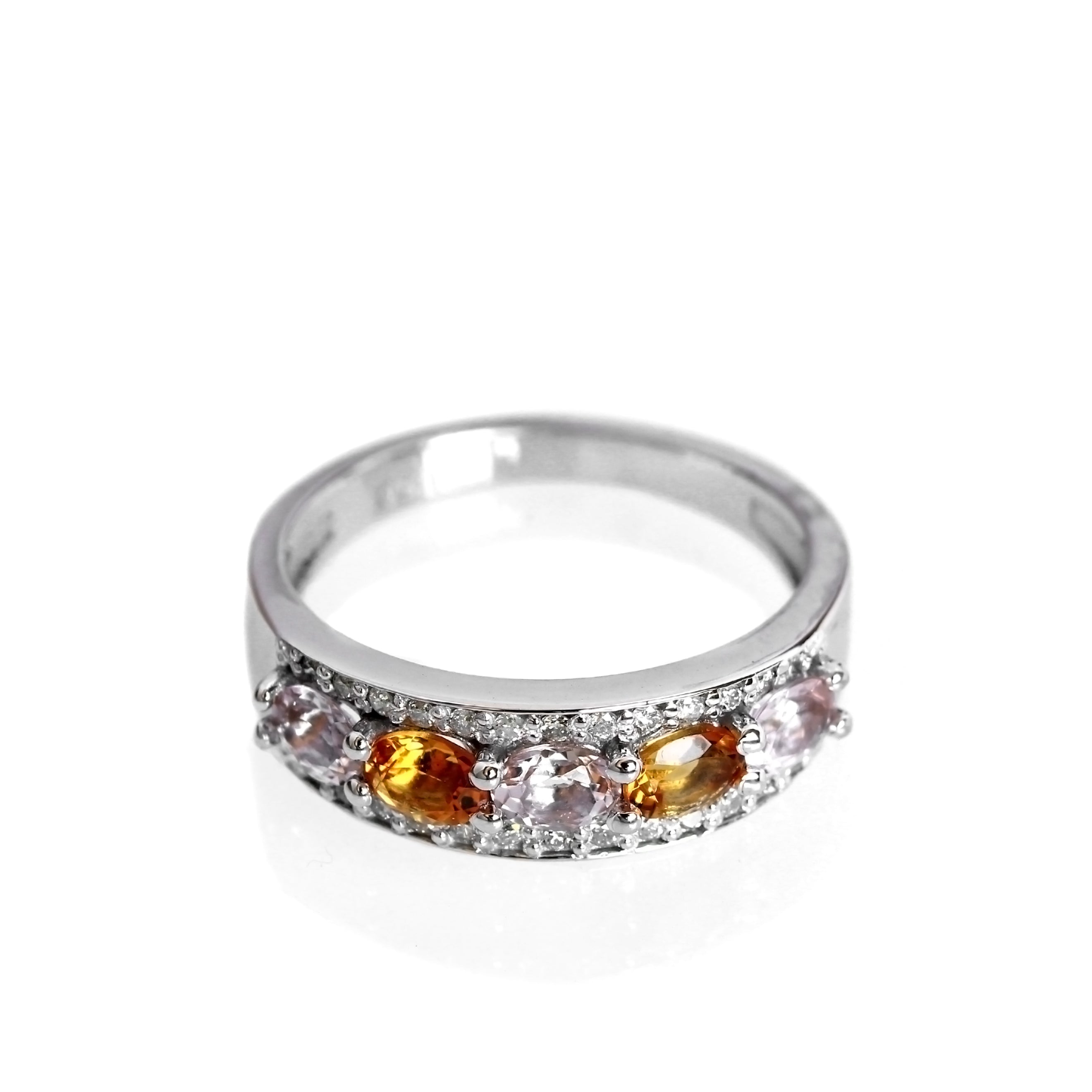 A lavish diamond dress ring featuring stunning faceted citrine and morganite gemstones, appropriate for formal occasions and parties.
