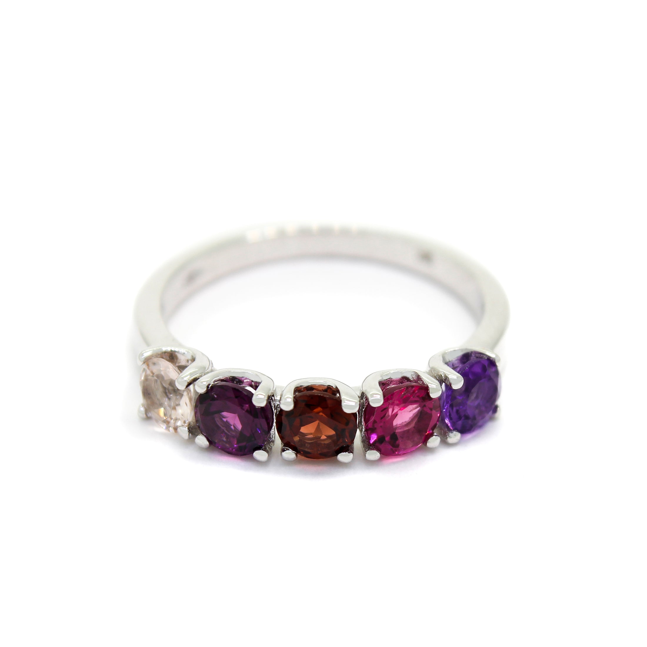 A bold multi-jewelled statement ring made up of 5 4.5mm round-cut mixed gemstones - morganite, grape garnet, red garnet, pink tourmaline & amethyst - for a stunningly lavish look.