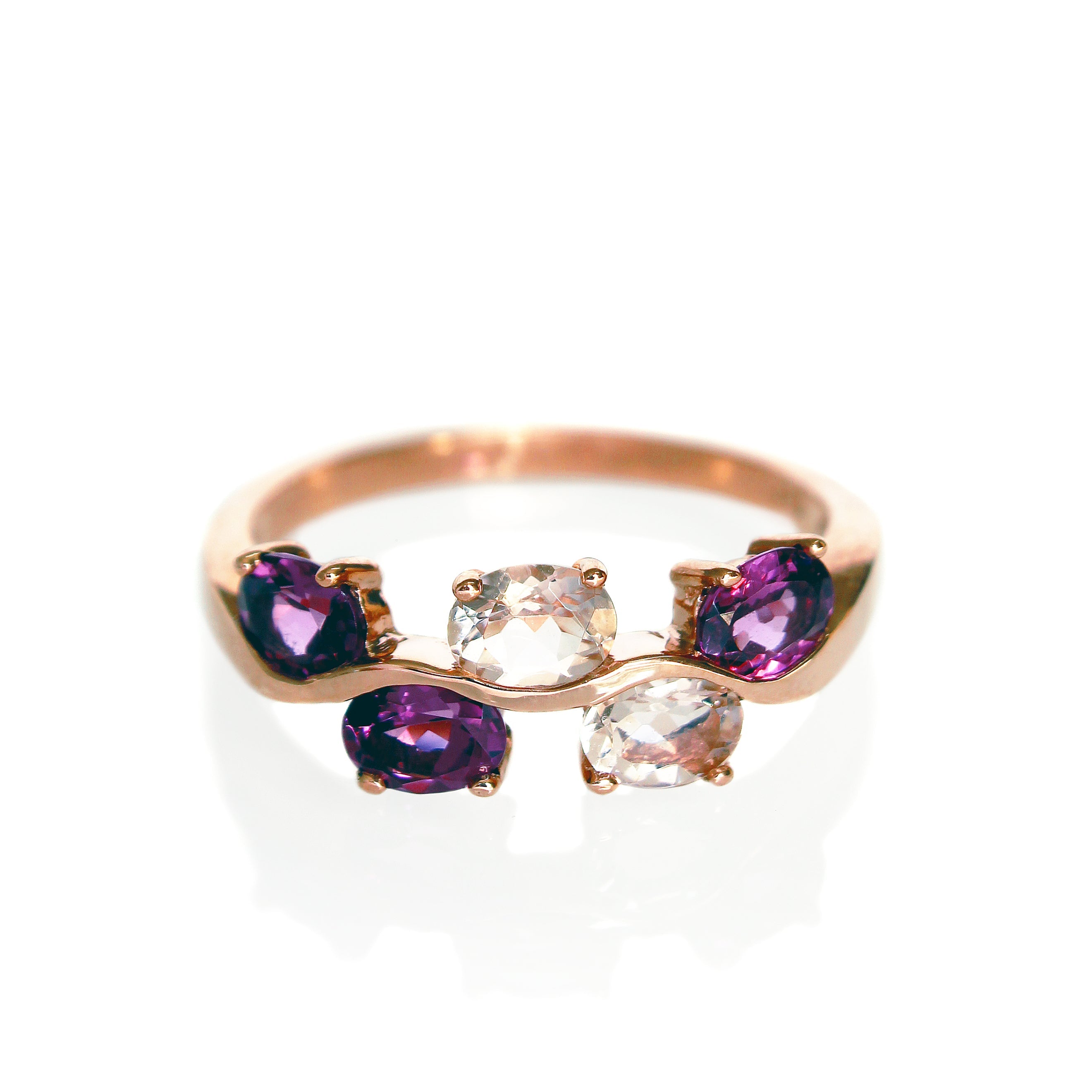 An elaborate rose gold ring adorned with grape garnet and pink morganite jewels.