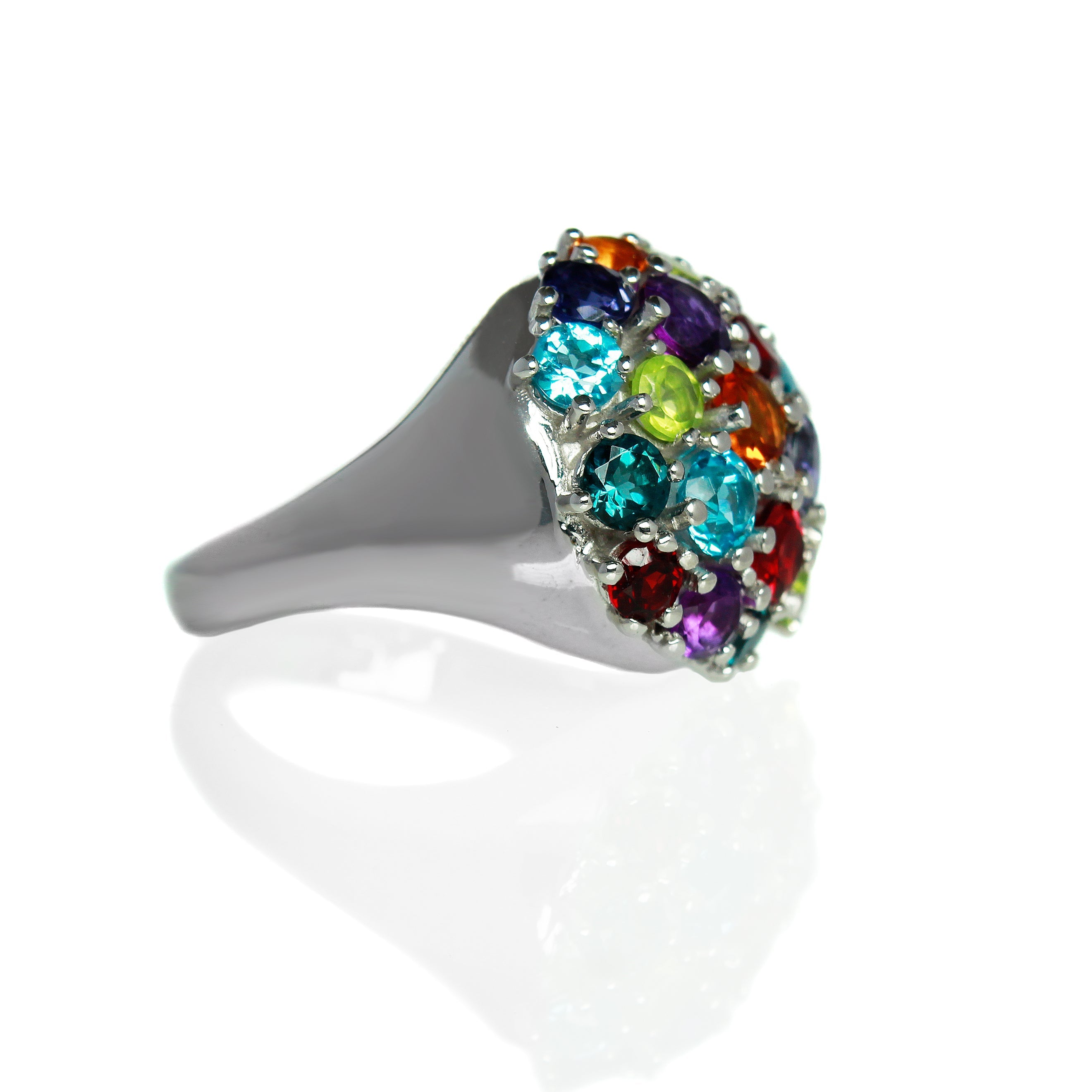 A bold and eccentric statement ring, boasting a cornucopia of round-cut birthstone jewels, each varying from 3mm to 4.5mm in size: London Blue topaz, garnet, citrine, peridot, sky blue topaz, iolite and amethyst.