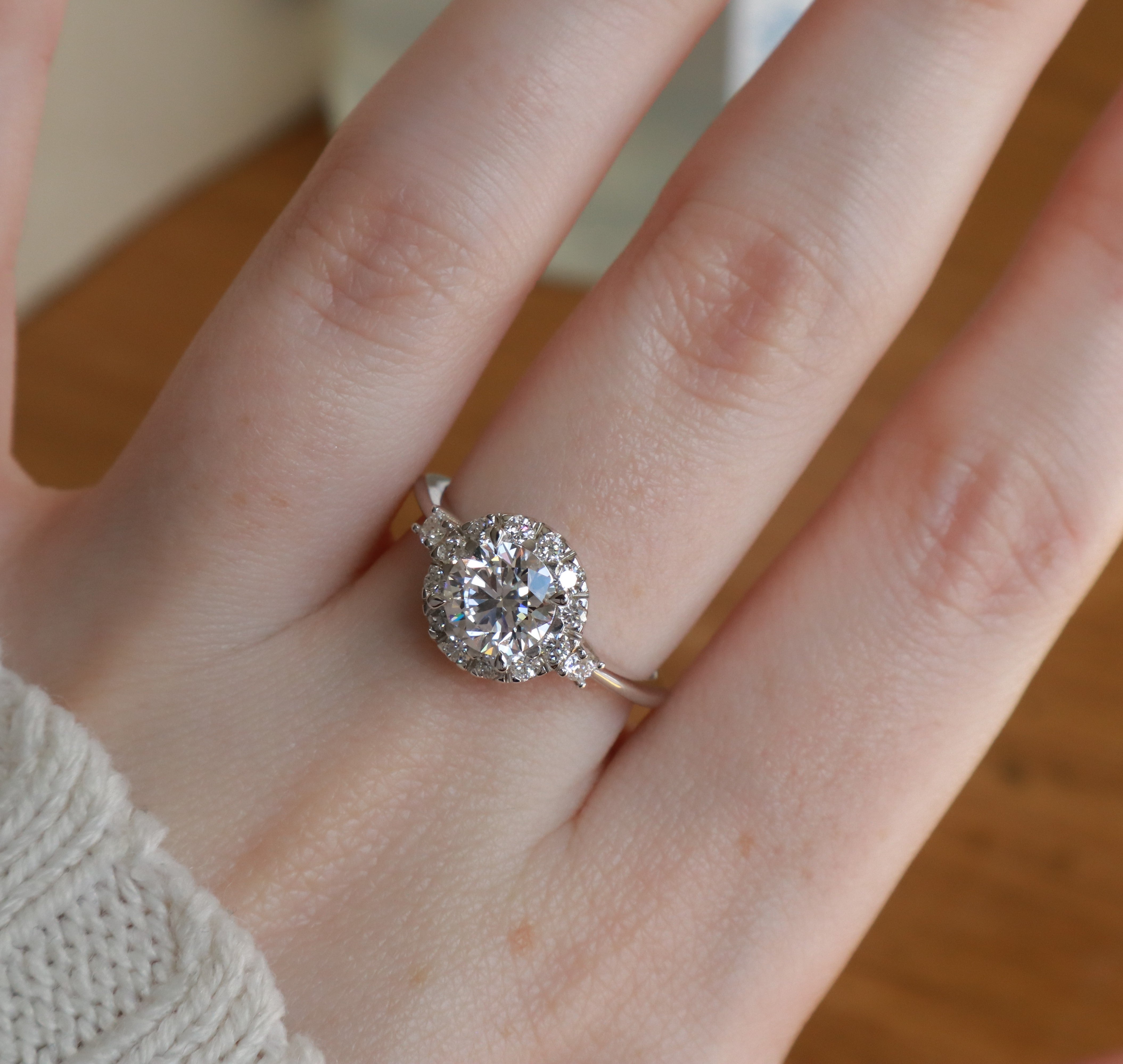 A glamourous vintage-inspired engagement ring featuring a dazzling halo of lab diamond jewels and white gold details.