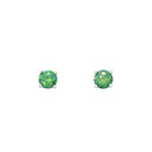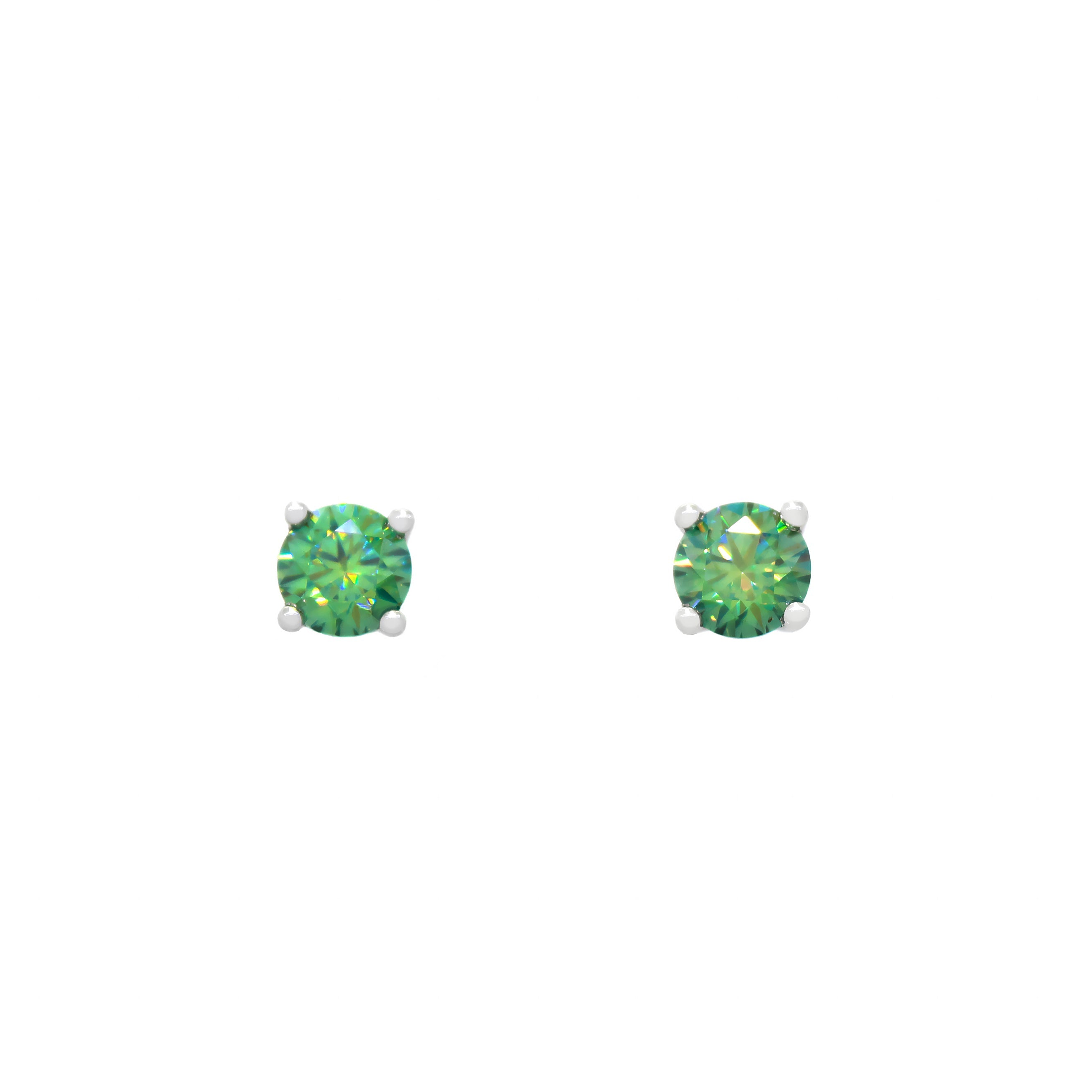 A delicate, staple pair of stunning 4mm round green moissanite stud earrings. Dainty enough for everyday wear, with green gemstones bright enough to add a pop to any outfit.