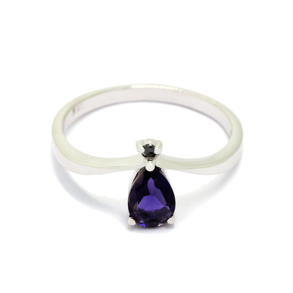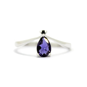A delicate iolite teardrop ring with a single black diamond accent.
