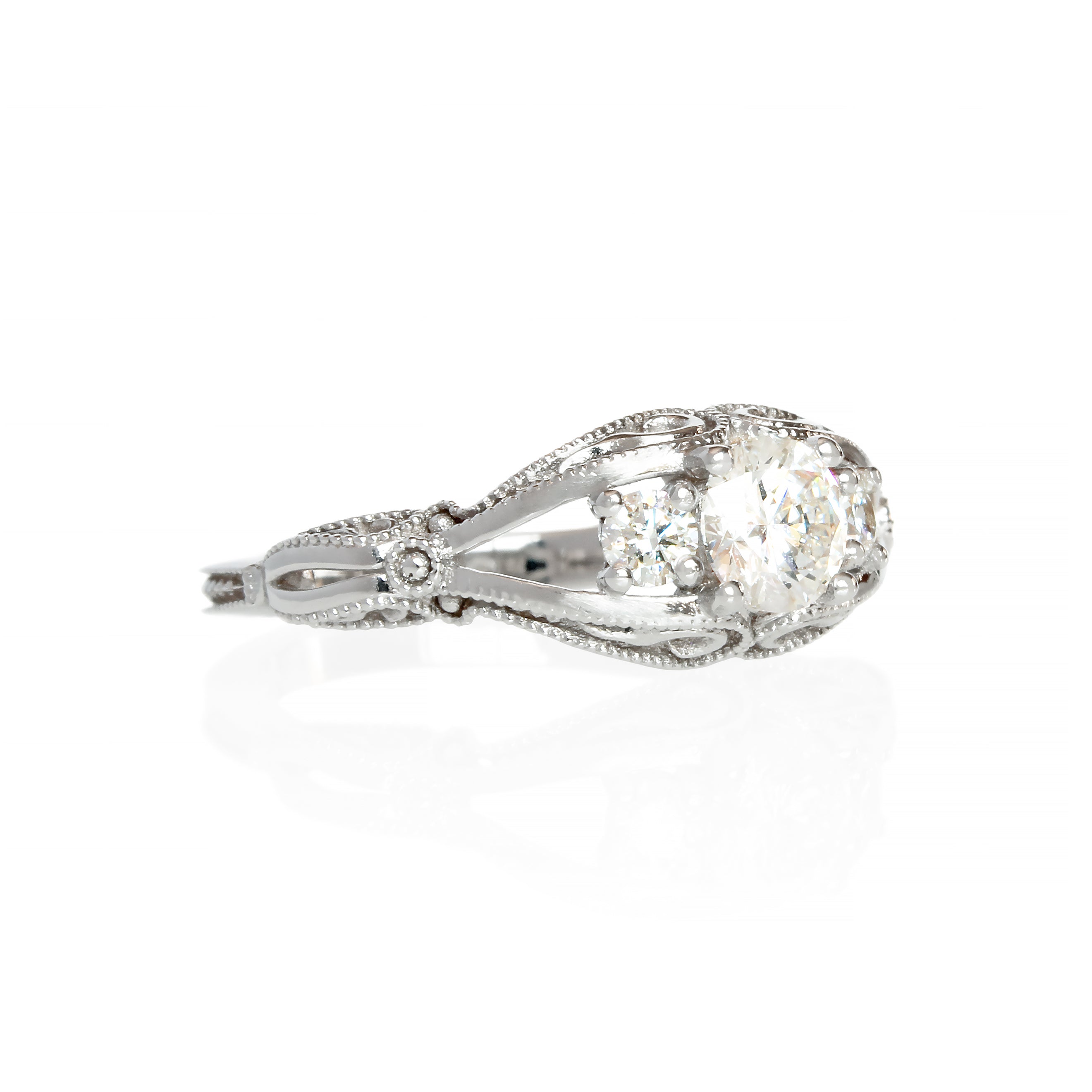 A mystical fantasy trilogy ring in solid 9k white gold with ornate filigree detailing, featuring a dazzling trio of lab diamond stones.