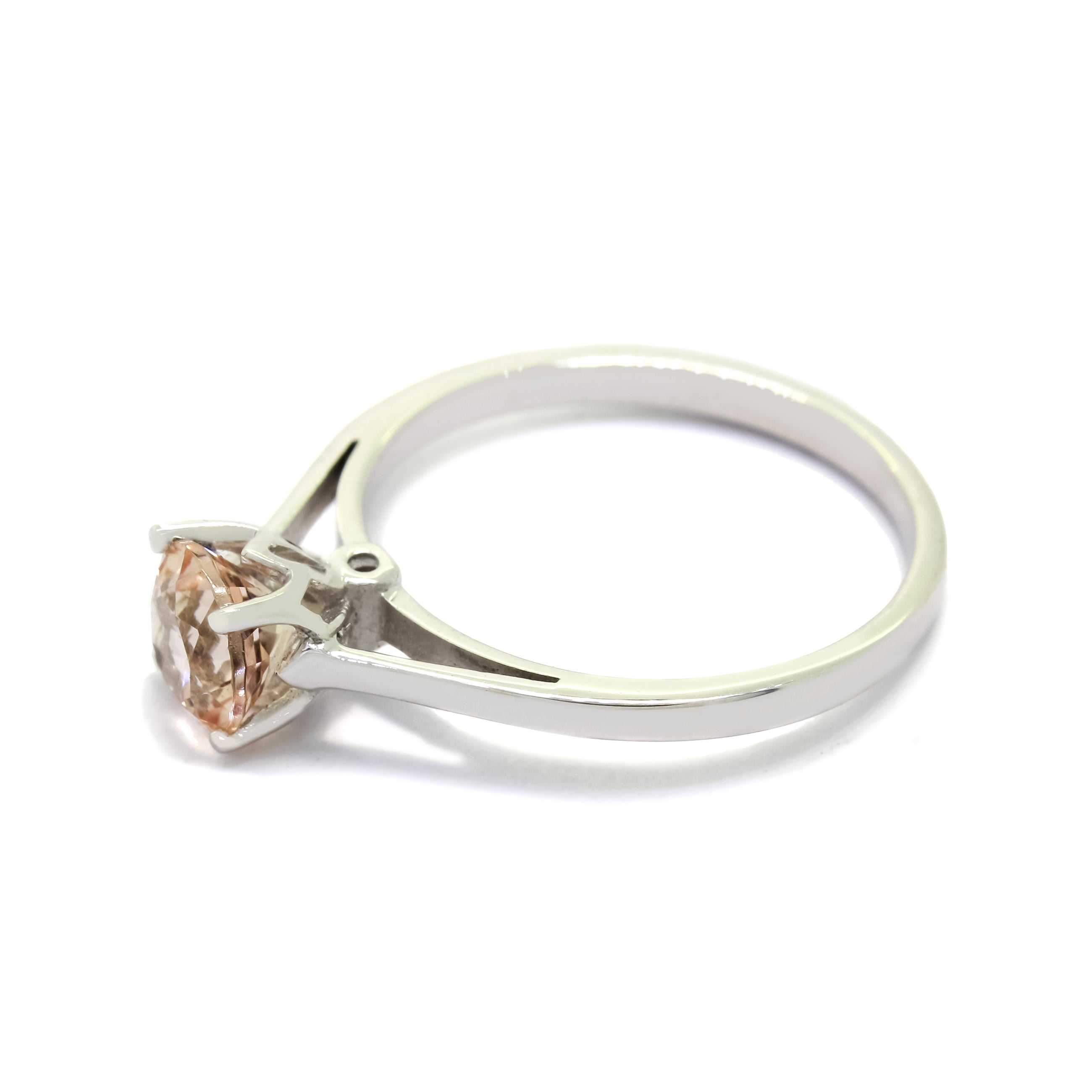 A deceptively ornate white gold morganite solitaire ring, with stylised floral detailing behind the stone.