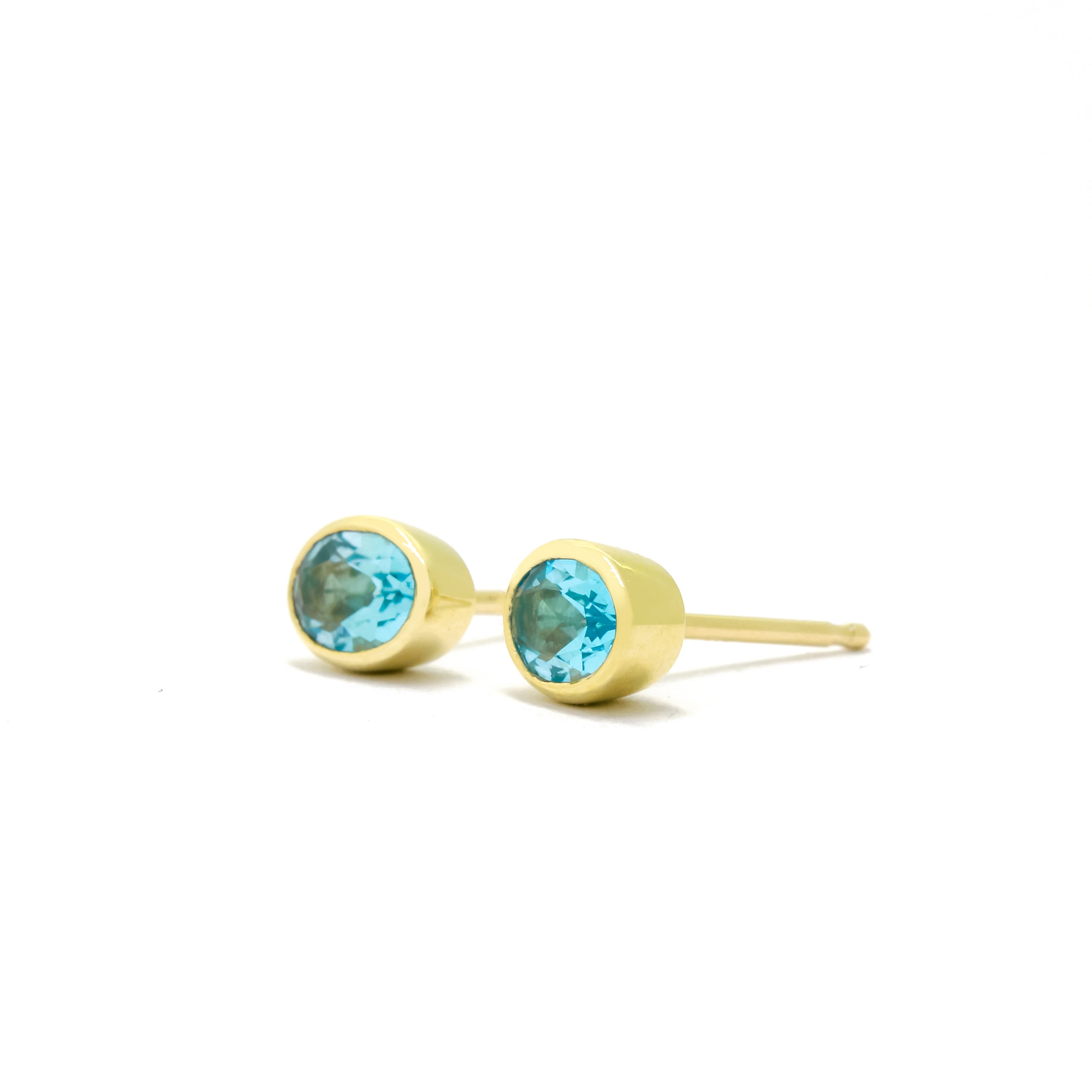 A sleek and minimalistic pair of two oval blue topaz earrings framed in solid 9ct gold.