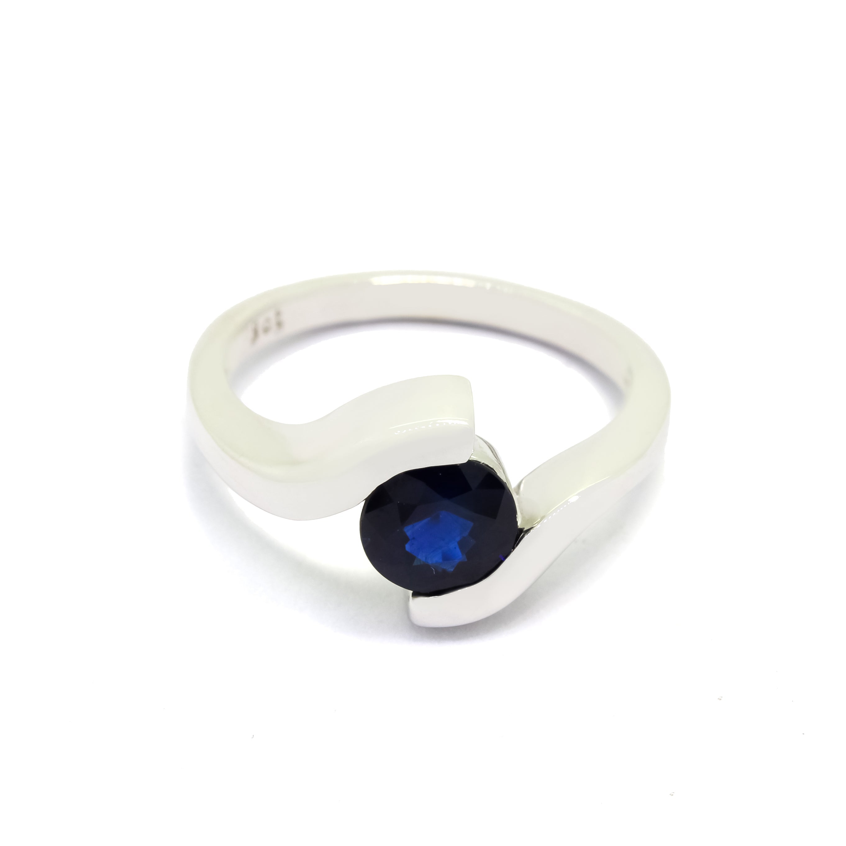 A modern, minimalistic sapphire ring with a curved band.