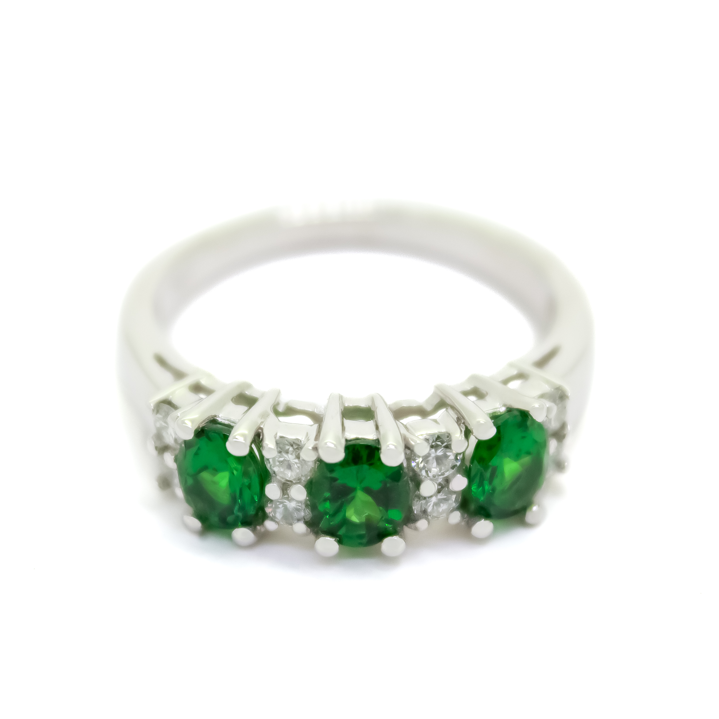 A boldly lavish tsavorite and diamond vintage styled ring in solid 9k white gold.