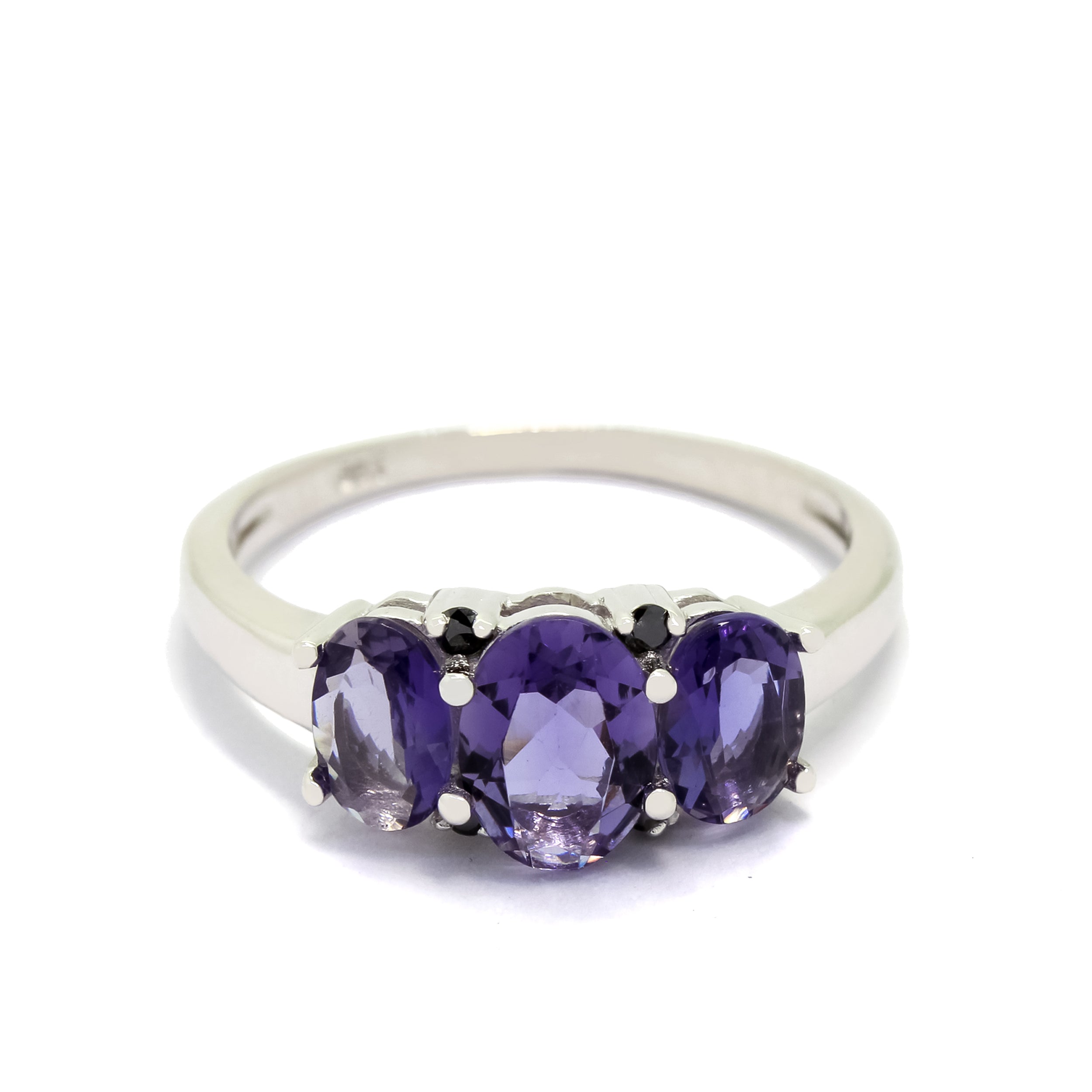 A bold and elegant golden ring with a stunning combination of iolite and black diamond detailing.