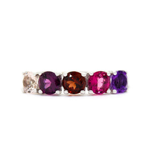 A bold multi-jewelled statement ring made up of 5 4.5mm round-cut mixed gemstones - morganite, grape garnet, red garnet, pink tourmaline & amethyst - for a stunningly lavish look.