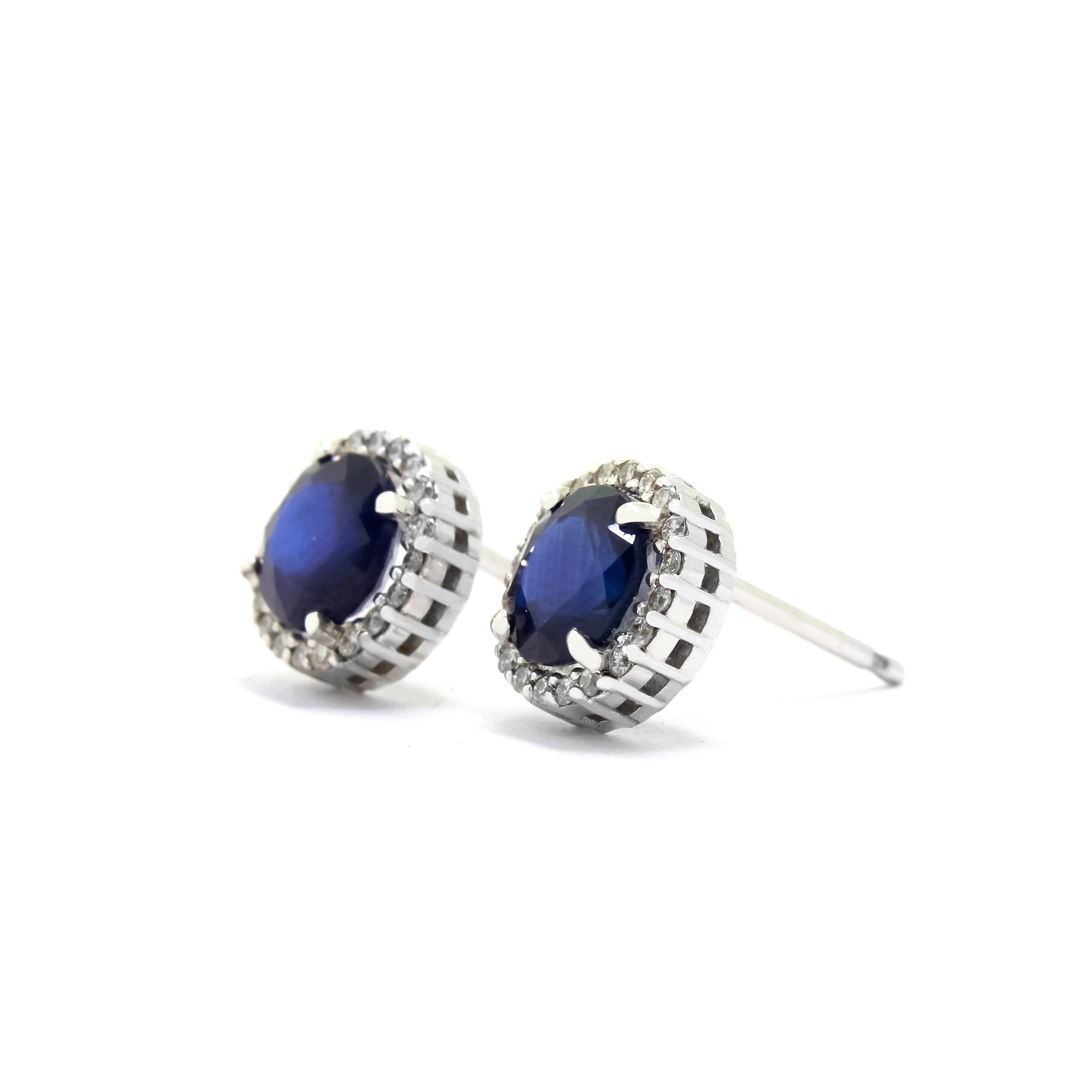 A lavish pair of 18ct diamond halo sapphire earrings with impressive 6mm stones, for a distinctly glamorous look. A stunning heirloom piece for any jewellery collection.