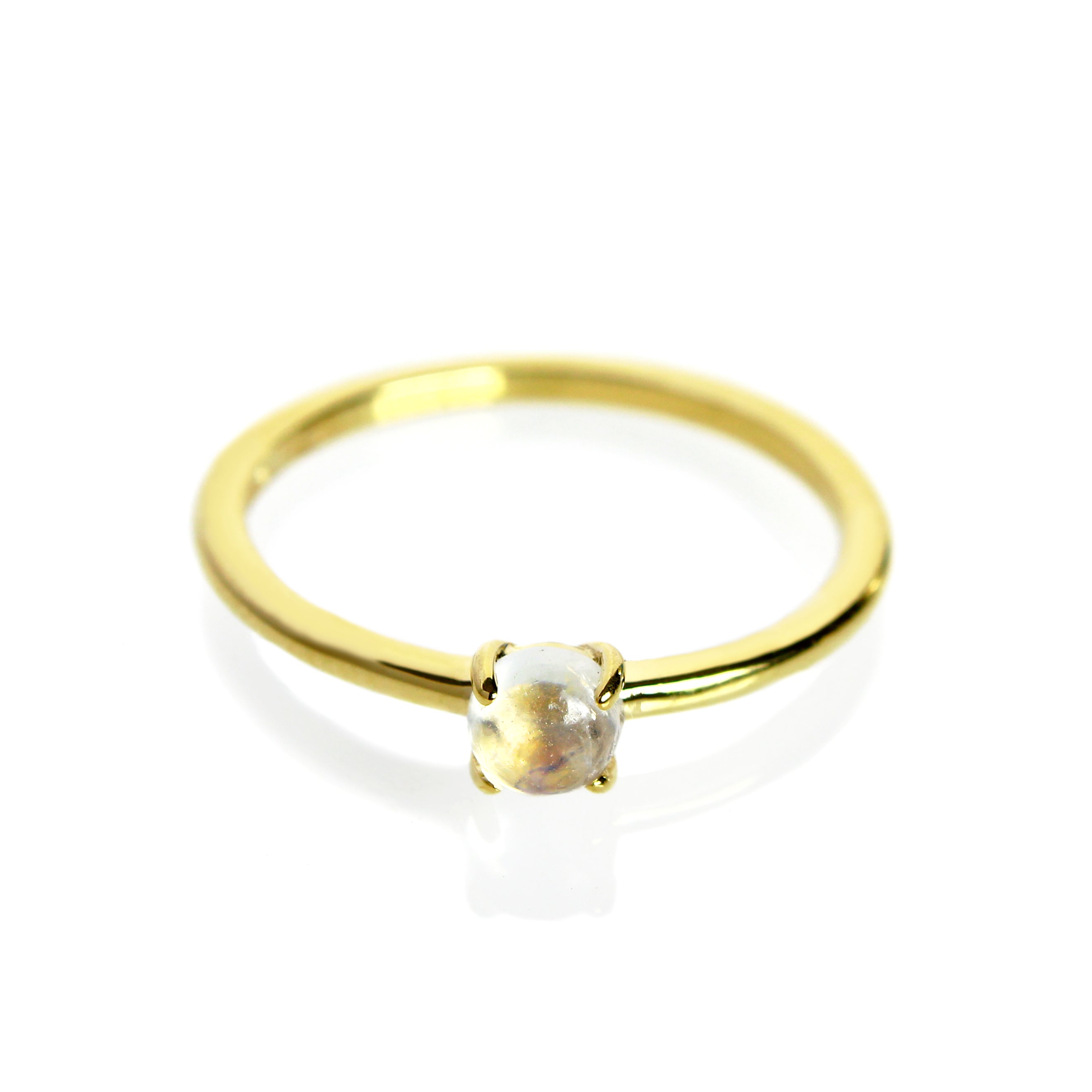 A delicate golden solitaire ring, featuring a single round moonstone gem. Perfect for stacking or solowear.