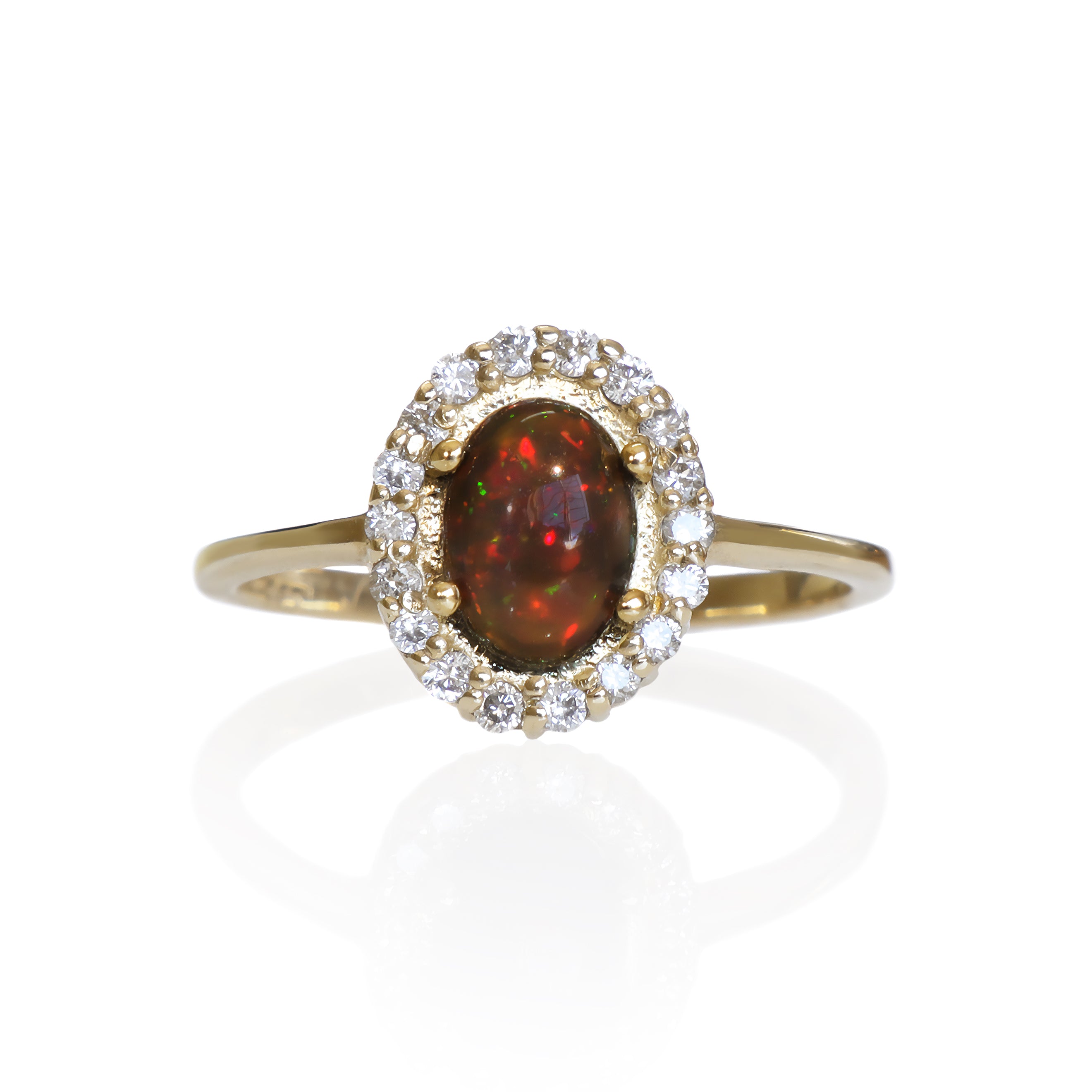 7x5mm Ethiopian Opal Diamond Halo Ring in 9k Yellow Gold