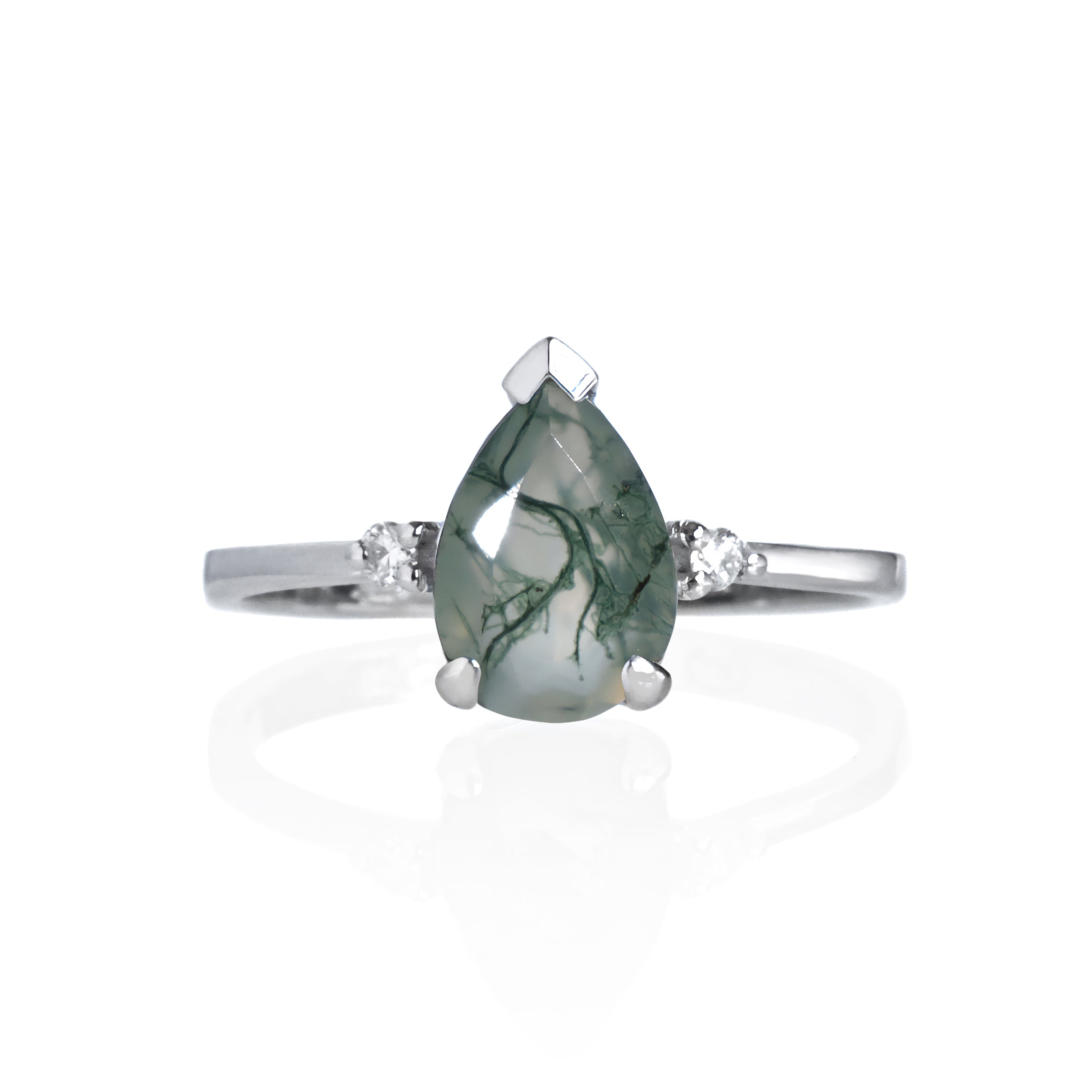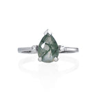 A feminine white gold ring, featuring a breathtaking moss agate centre stone embraced by two earth-grown diamonds on either side, appropriate for any occasion.