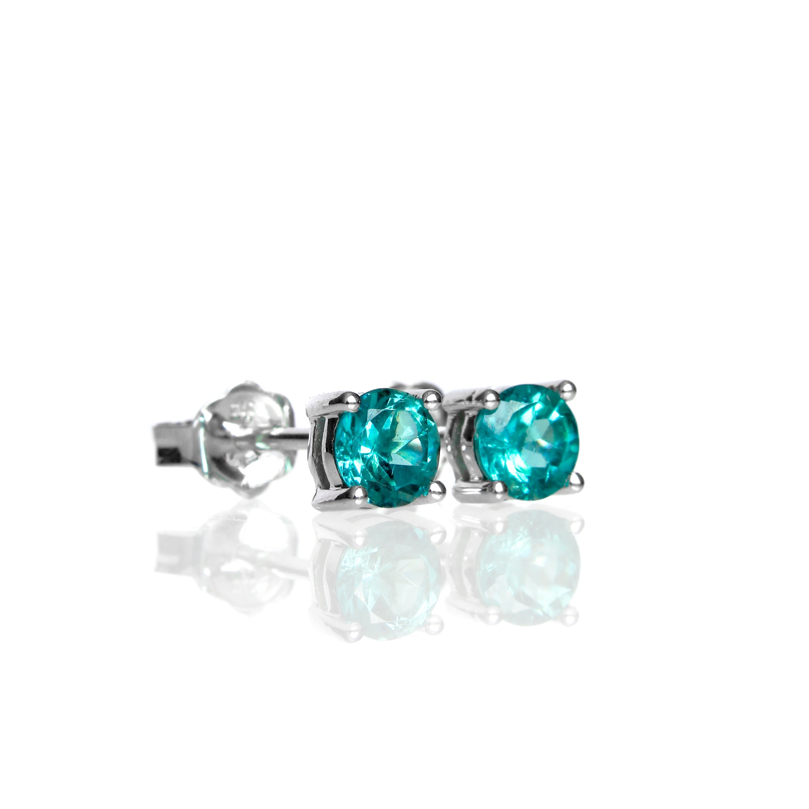 A staple pair of stunning 4.5mm round vibrant green-blue tourmaline stud earrings set in solid 9k white gold. Perfect for any occasion.