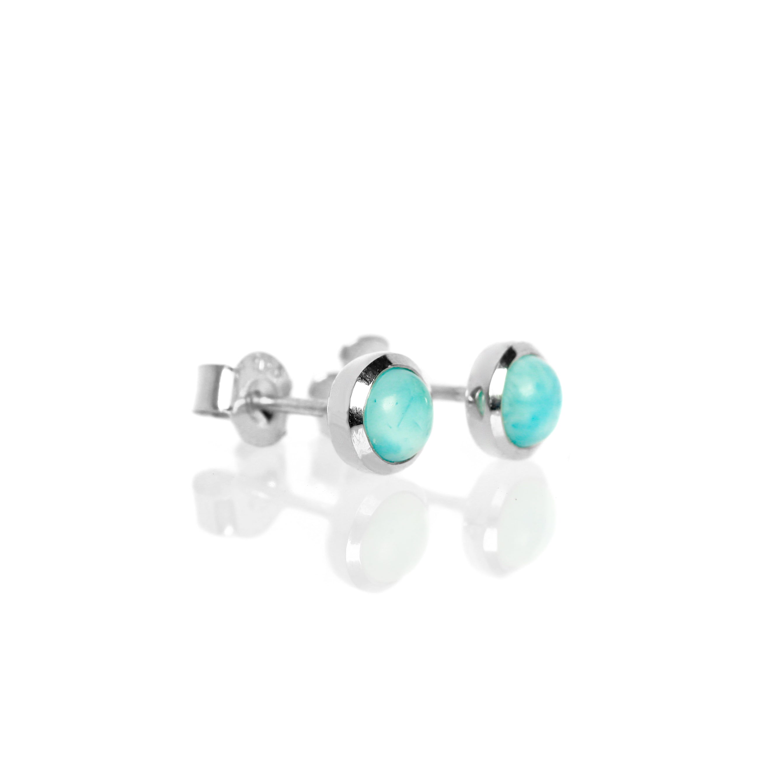 A staple pair of sterling silver stud earrings featuring uniquely-patterned Larimar stones in bezel settings.