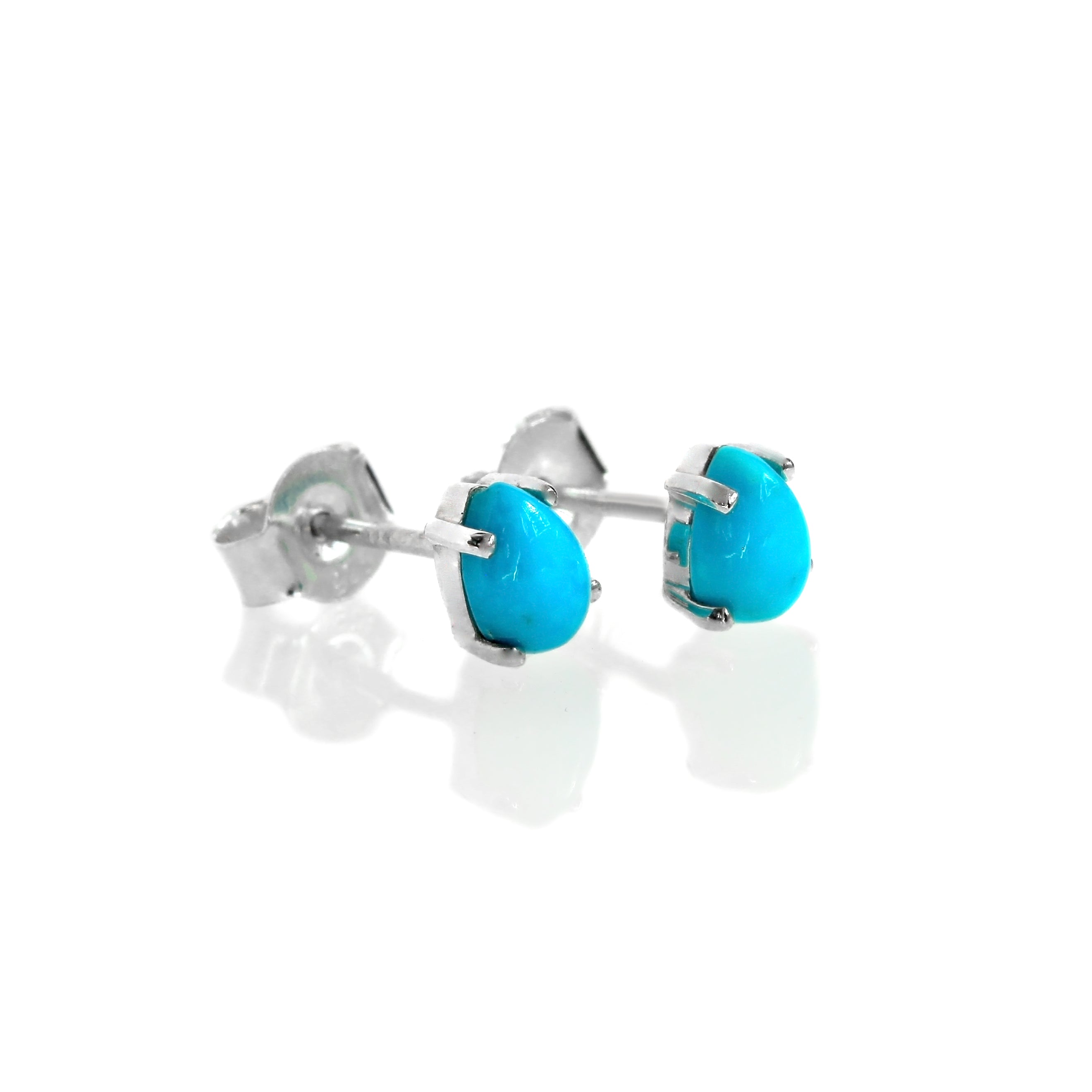 A staple pair of sterling silver stud earrings with dainty 5x4mm pear-shaped turquoise gemstones, appropriate for everyday wear.