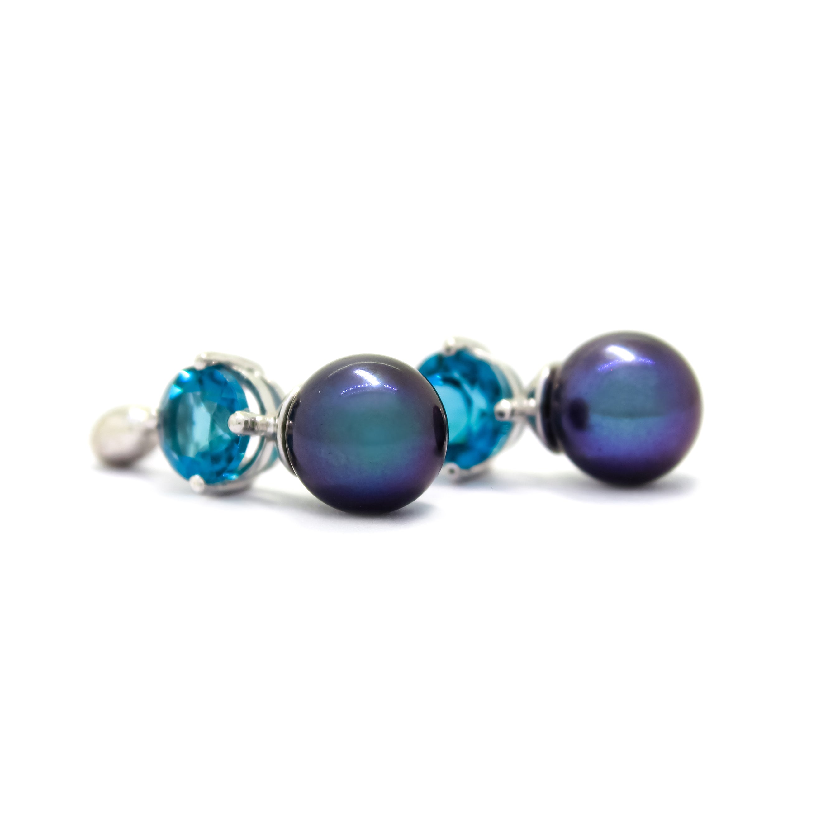 Elegant 6mm peacock pearl drop earrings with matching 6mm London Blue Topaz jewels, for a sophisticated look.