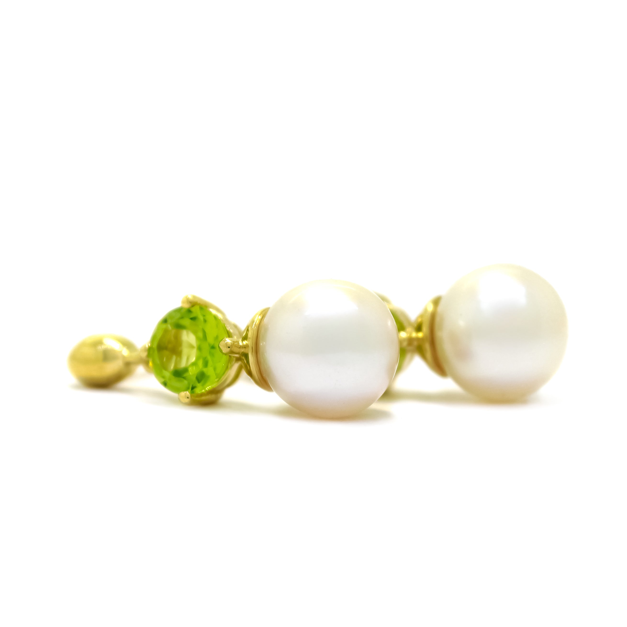 Elegant 7mm white pearl drop earrings with matching peridot jewels, for a sophisticated look.