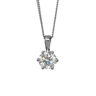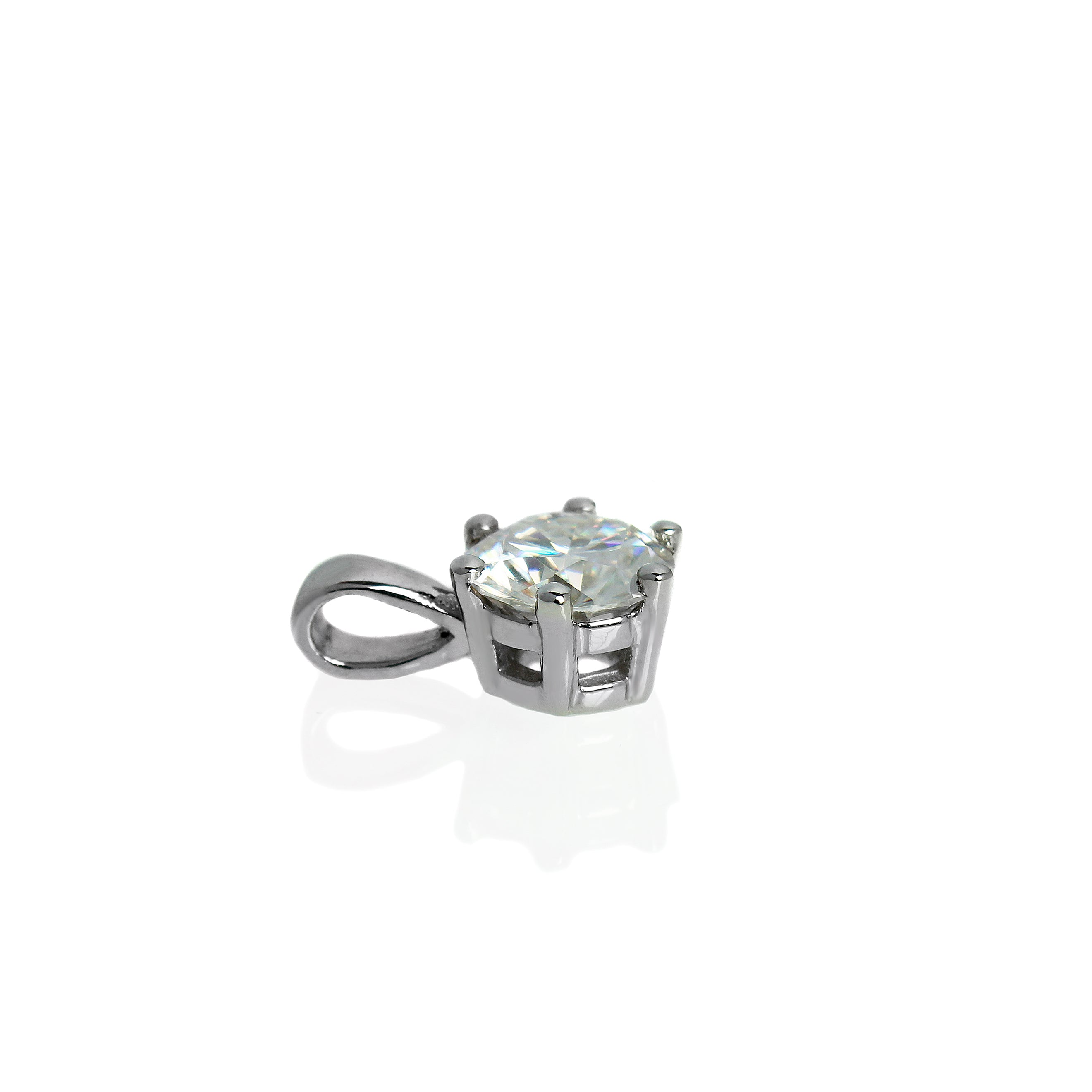A dazzling 7mm round-cut moissanite pendant framed by 6 sterling silver claws. Chain not included.