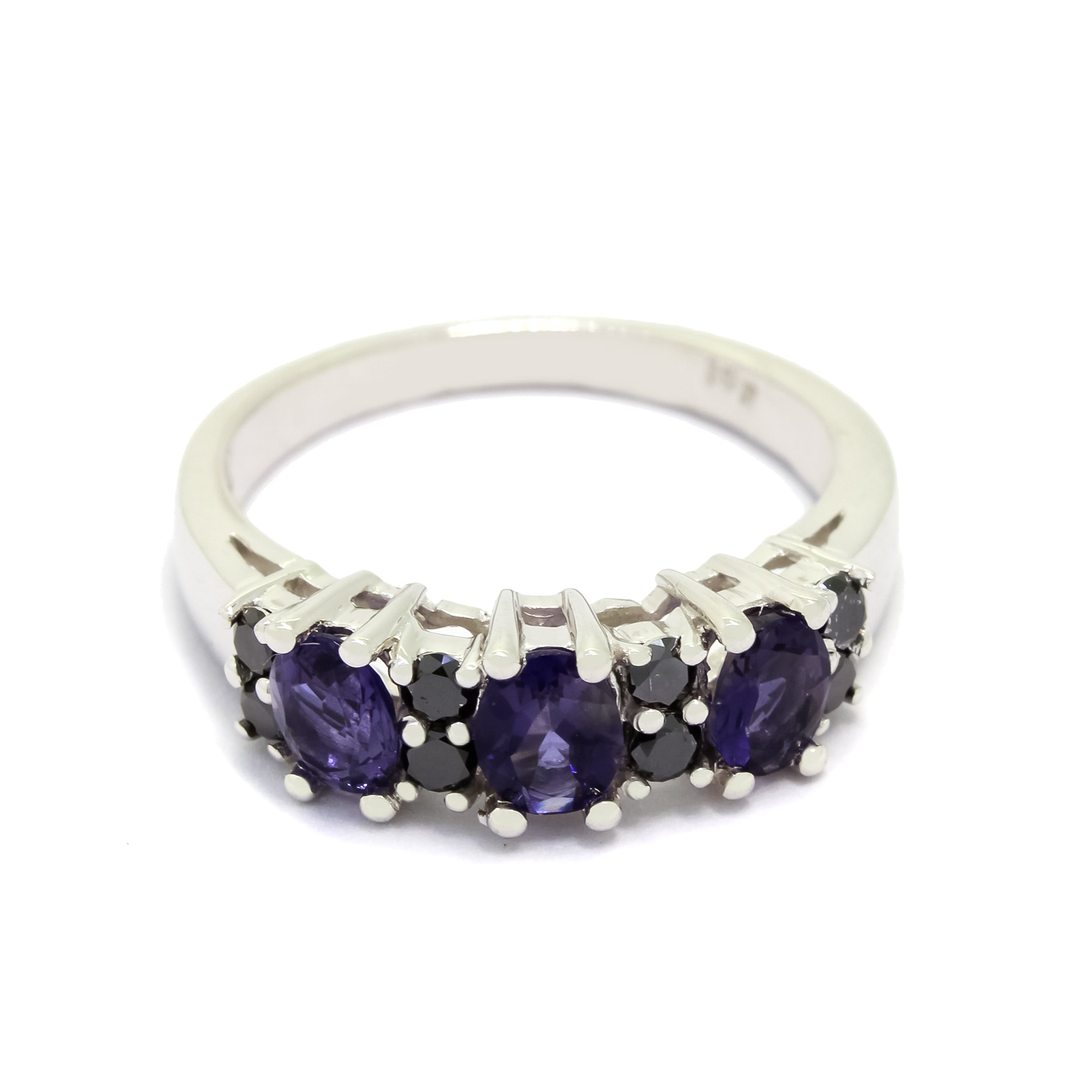 A boldly lavish iolite and black diamond vintage styled ring in solid 9k white gold.
