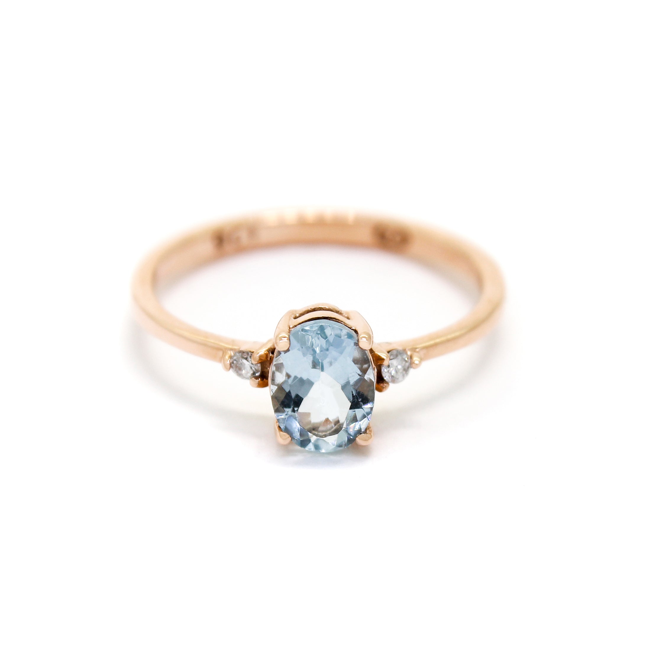 A dainty and elegant rose gold ring with a stunning trio of 7x5mm aquamarine and diamonds.