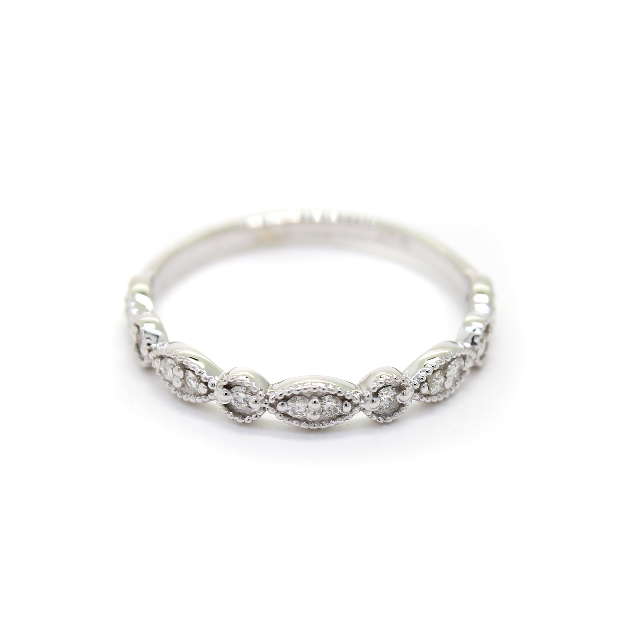 An ornate half-eternity ring with alternating shapes and milgrain detailing, bejewelled with 14 (0.01ct) round-cut diamonds.