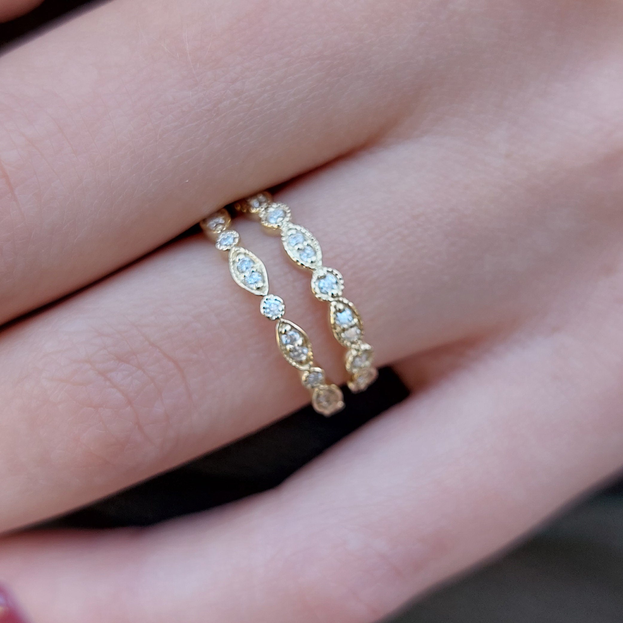 An ornate half-eternity ring with alternating shapes and milgrain detailing, smoothing out into a flat yellow gold band. A single moissanite stone is at the centre of the ring
