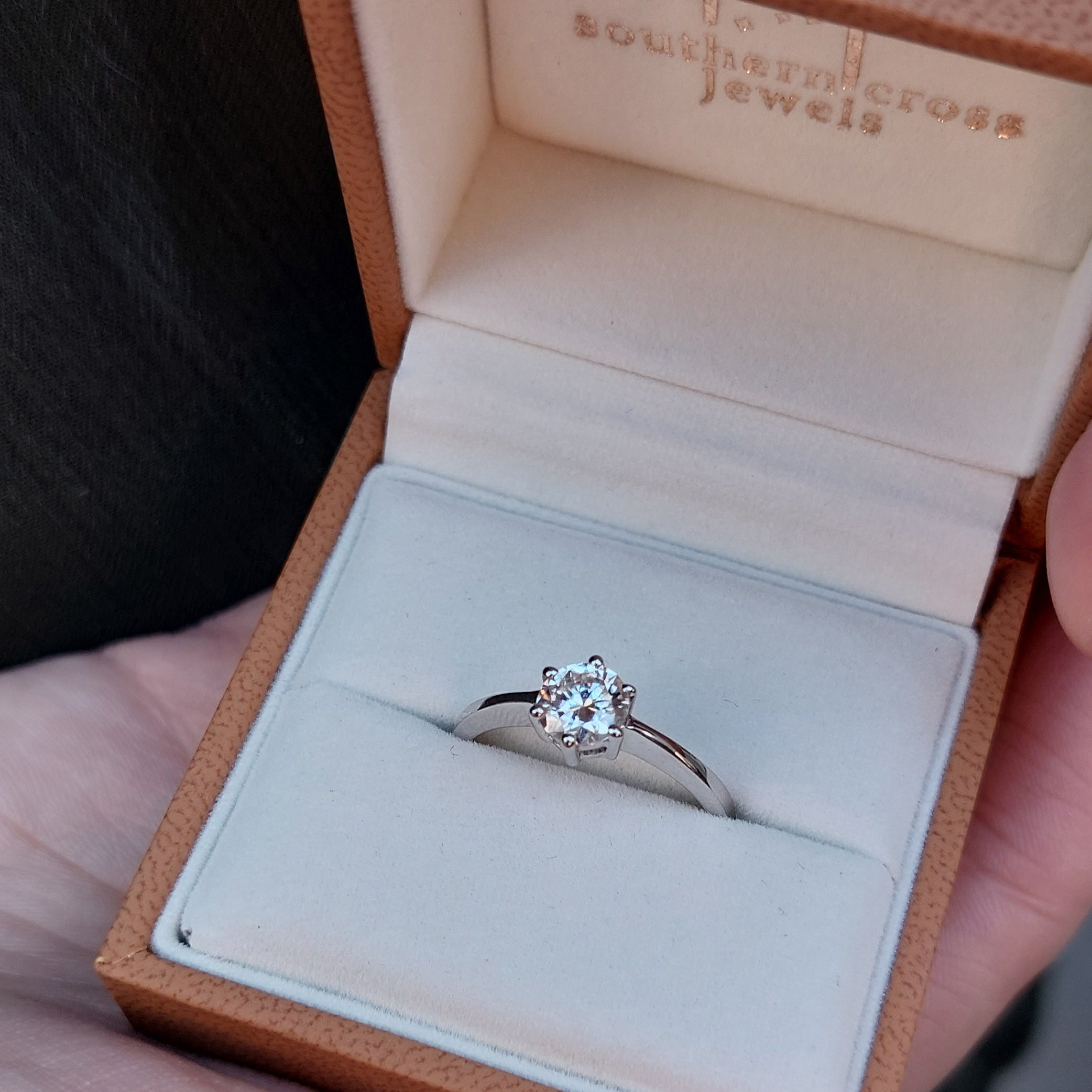 A single brilliant moissanite jewel encased by six claws.